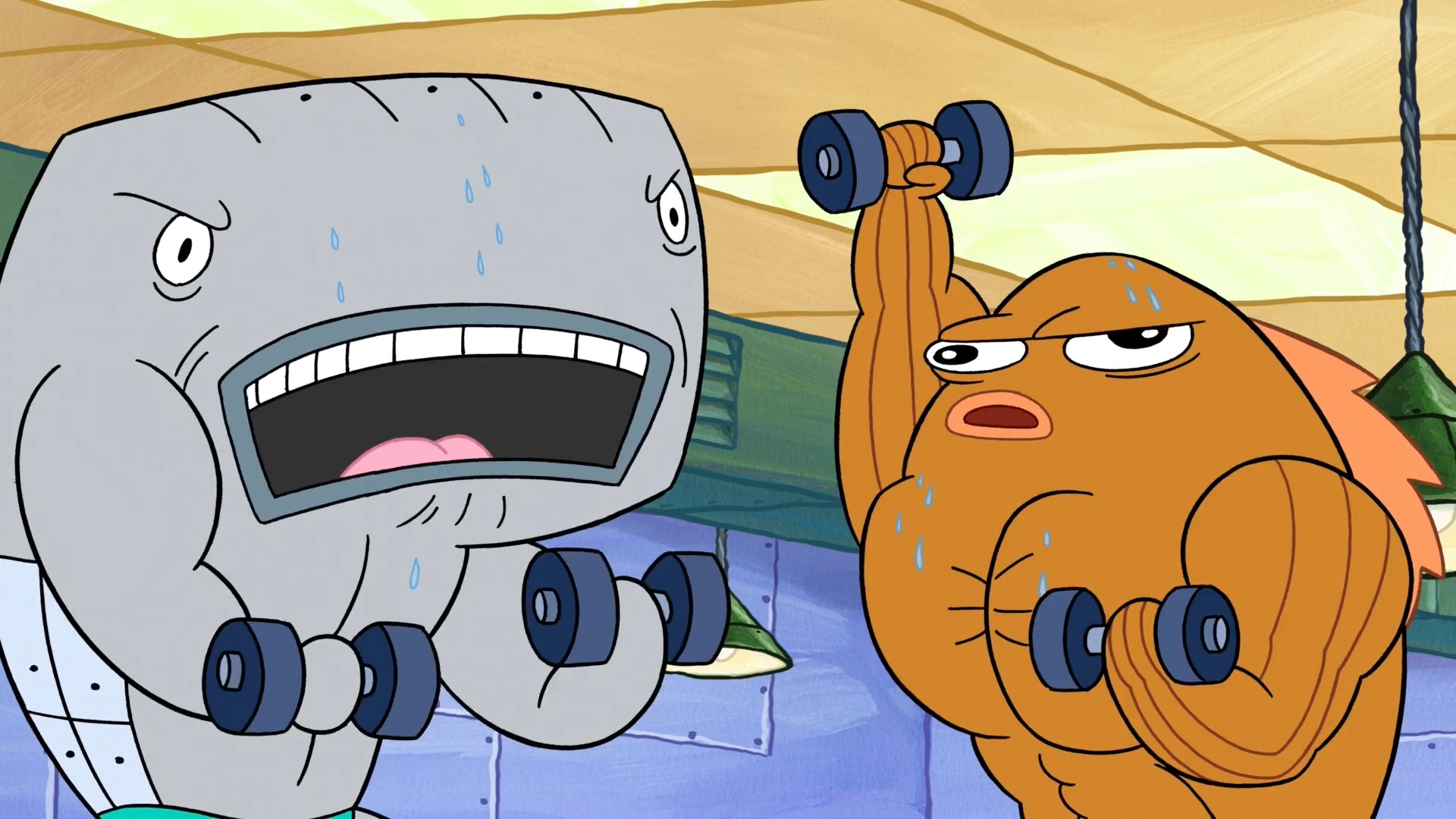 He is seen lifting weights with Incidental 24 on top of a barbell that Larry is lifting.