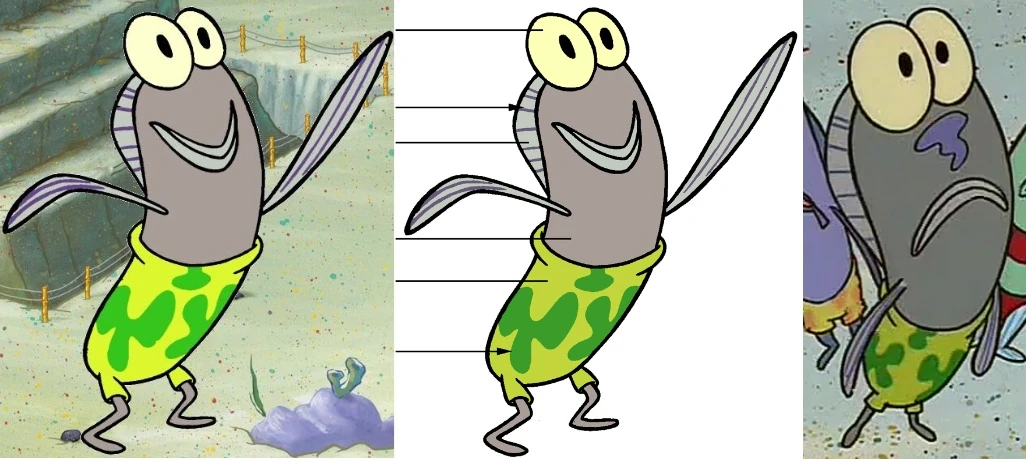 He is a grayish-brown fish with light yellow eyes and gray lips. He wears light green shorts with a dark green flower design, which are similar to Patrick's. In his older appearances, his eyes were a darker shade of light yellow, and the lines on his fins were colored purplish-gray instead of their default violet color. In his even older appearances, he had a purple dollop of sunscreen on where his nose would be.
