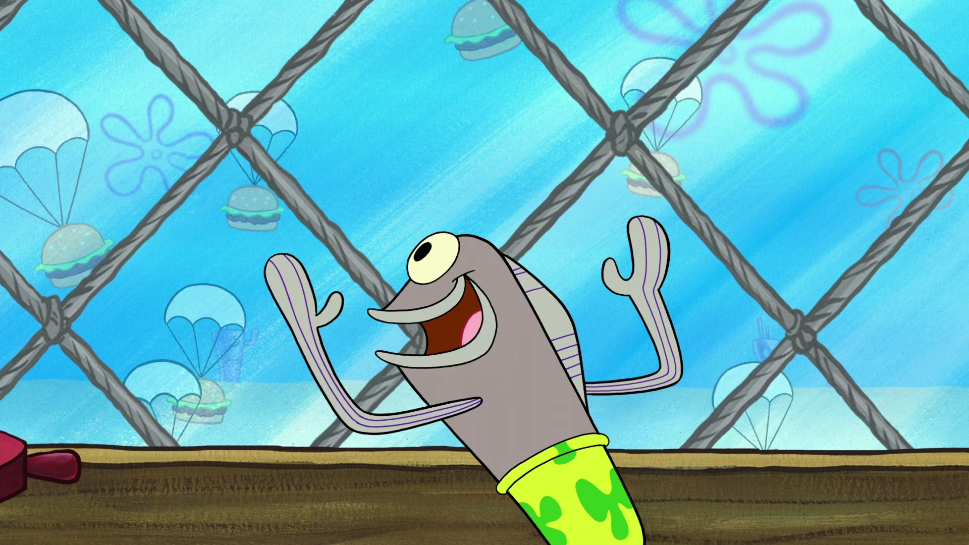 He is seen receiving his food from Squidward when Mr. Krabs enters the Krusty Krab.