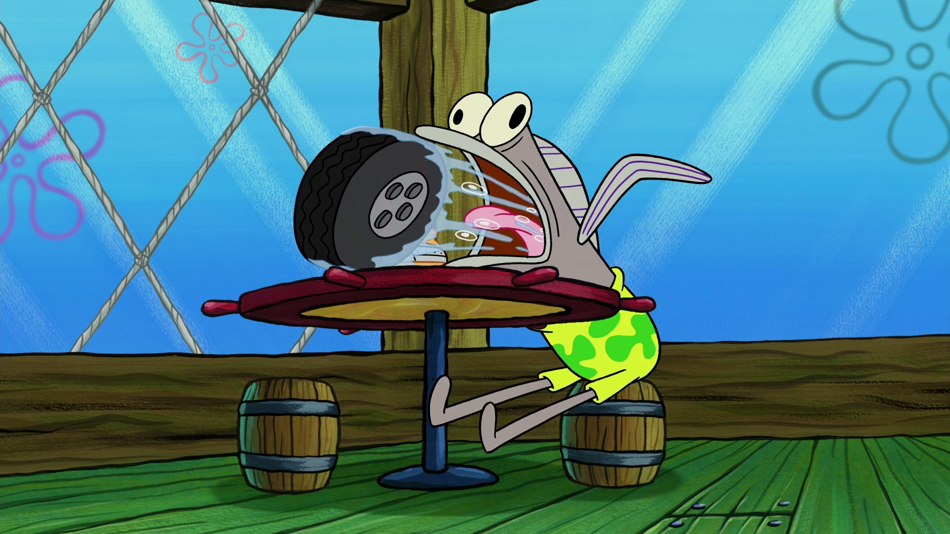 Mr. Krabs sees him standing outside of the Krusty Krab and asks him why he doesn't want a Krabby Patty. He claims the restaurant is too far away and a food truck drives by and gets him food instead. This prompts Mr. Krabs to have SpongeBob and Squidward drive a food truck around Bikini Bottom.