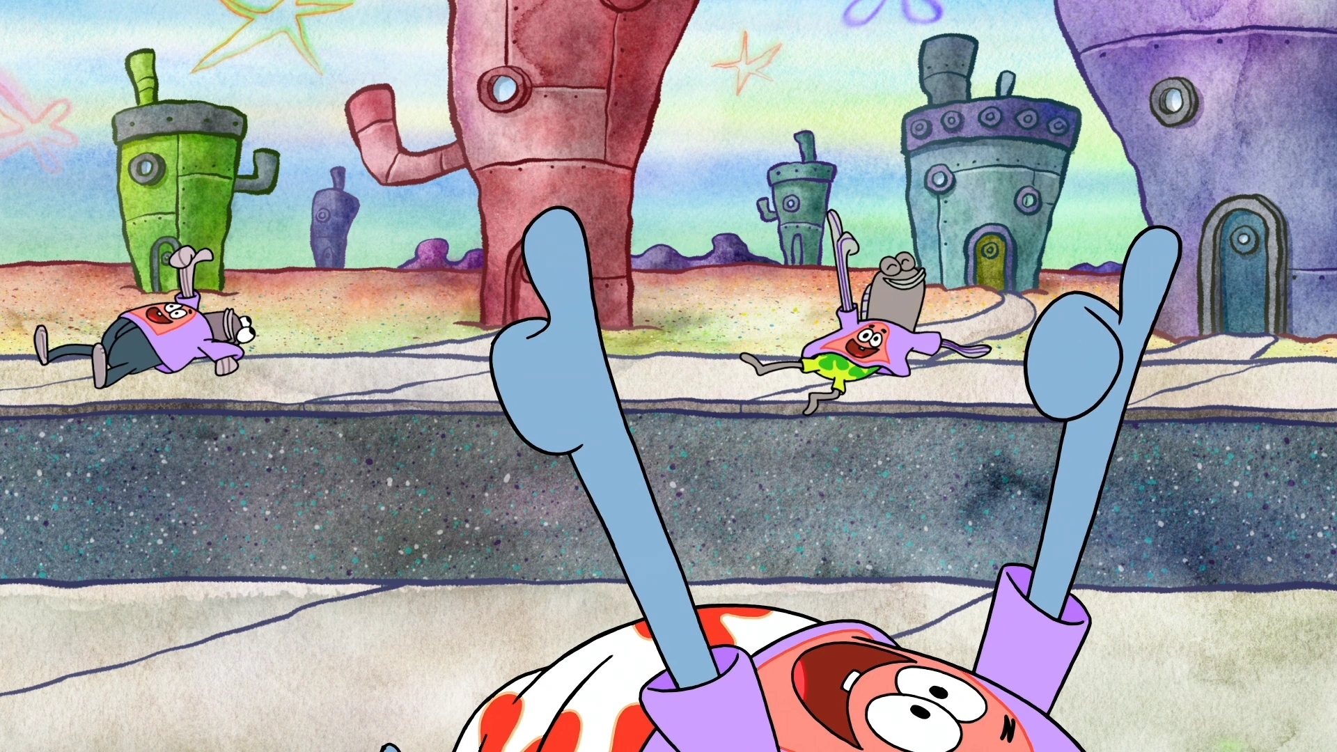 Patrick stands on top of Fred, Incidental 5, and Incidental 37A after ruining the playground.