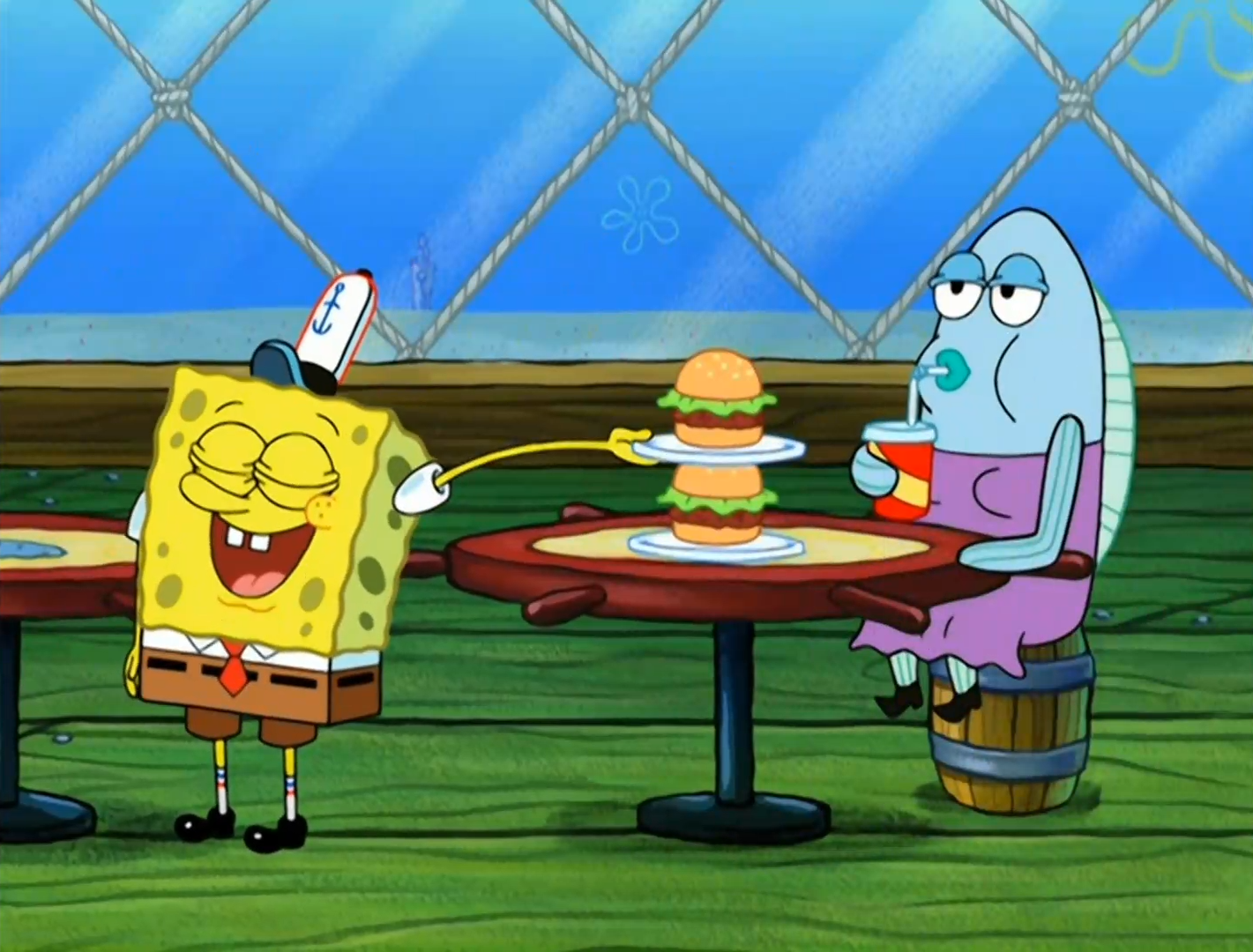 SpongeBob leaps onto hers' and Fred's table after he comes out of Incidental 73's shirt.