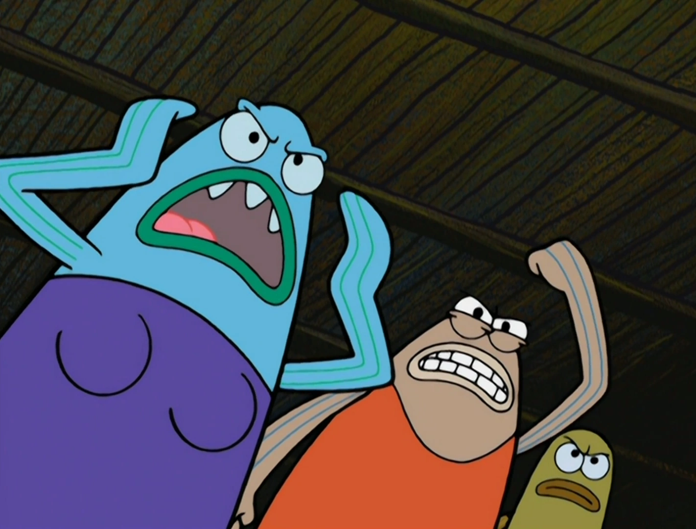 She appears as one of the rioters who carry Squidward over to his burying spot after the rioters brutally punch him.