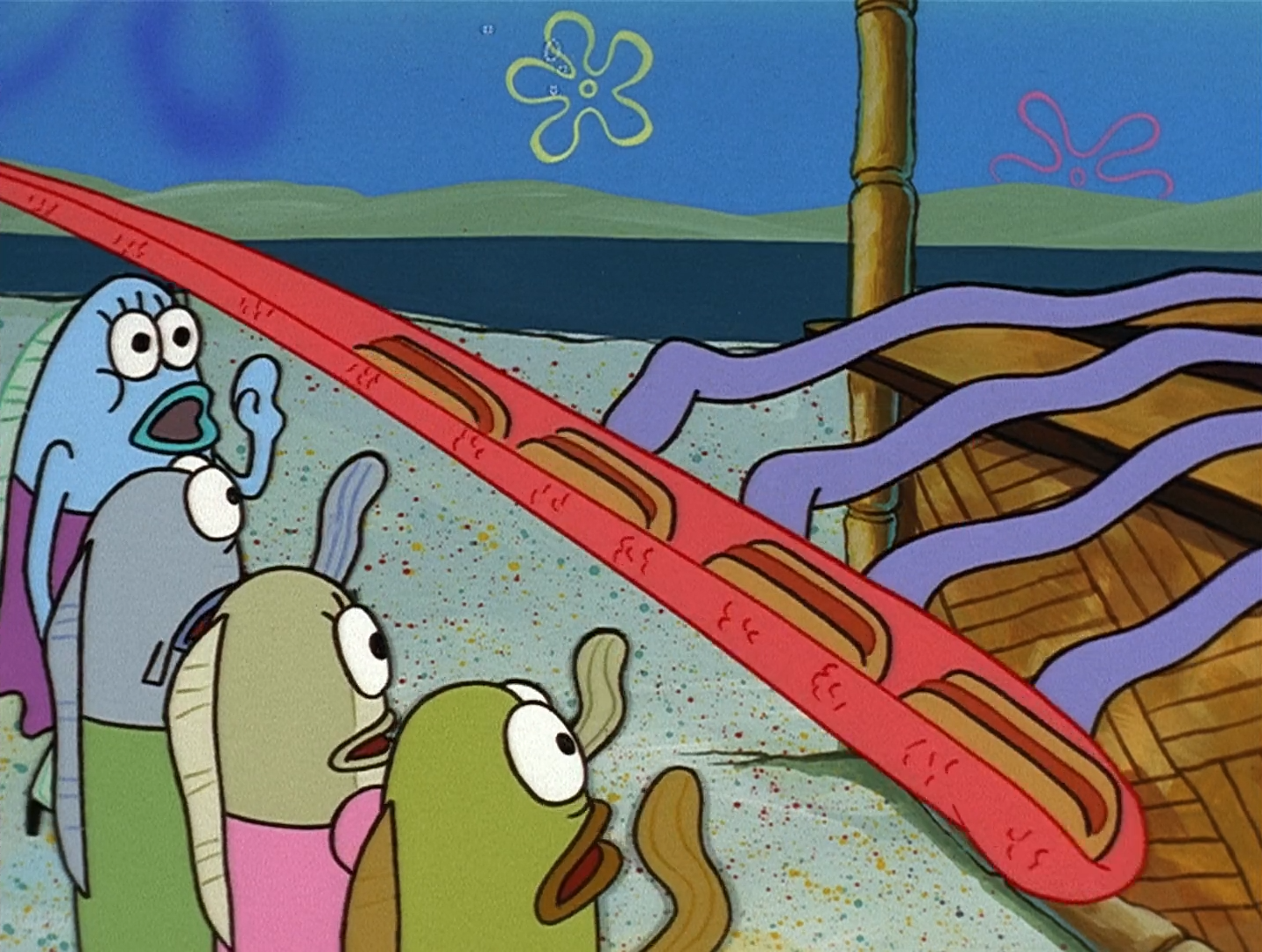 She is about to receive a hot dog from the octopus vendor, but SpongeBob uses his tongue to swallow it up before she could take it.