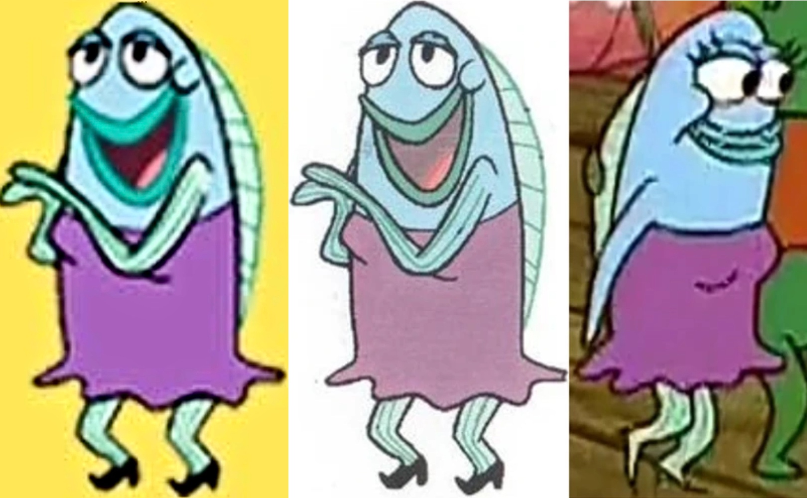 She is an aqua-blue fish with light teal lips and light aqua-green fins. She wears a purple dress and black shoes. In her older appearances, her arms were colored aqua-blue like her skin and the outline of her lips was colored black instead of its default dark teal out line. In her even older appearances, her eyes were closer, she had no shoes, and lacked arm detailing.