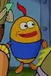 He is a short, yellow-orange fish with a wisp of red hair. He wears a blue T-shirt.