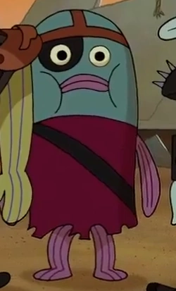 He is a turquoise fish with hot pink fins. He wears a dark blue bandana, a yellow shirt, and dark blue shorts.