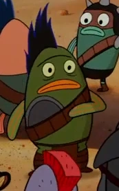 He is an army green fish with a very large yellow-orange dorsal fin. He wears a light brown shirt, dark brown pants, and has a necklace.