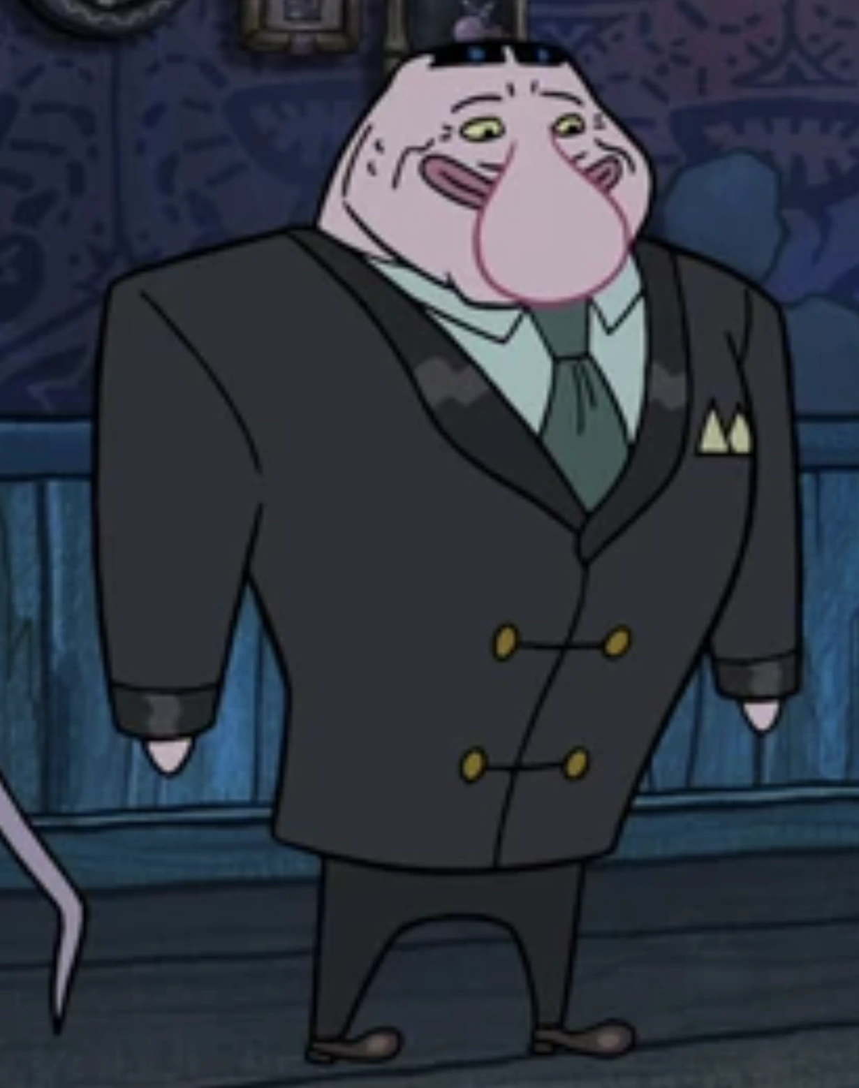 He is a short light pink blobfish with chubby cheeks and pink warts. He wears a green shirt, a red kerchief, and dark green pants. He is covered in slime that, according to him, tastes like maple syrup.