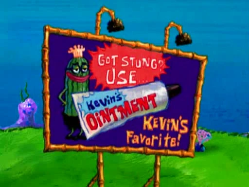 Kevin advertises his ointment during the Biannual Jellyfish Convention. It is seen on various banners throughout the convention. Kevin also uses his ointment several times off-screen to heal himself of jellyfish stings when he is giving SpongeBob his "initiation." Kevin's Ointment makes its first appearance after it is seen under a bush and later appears on a billboard.