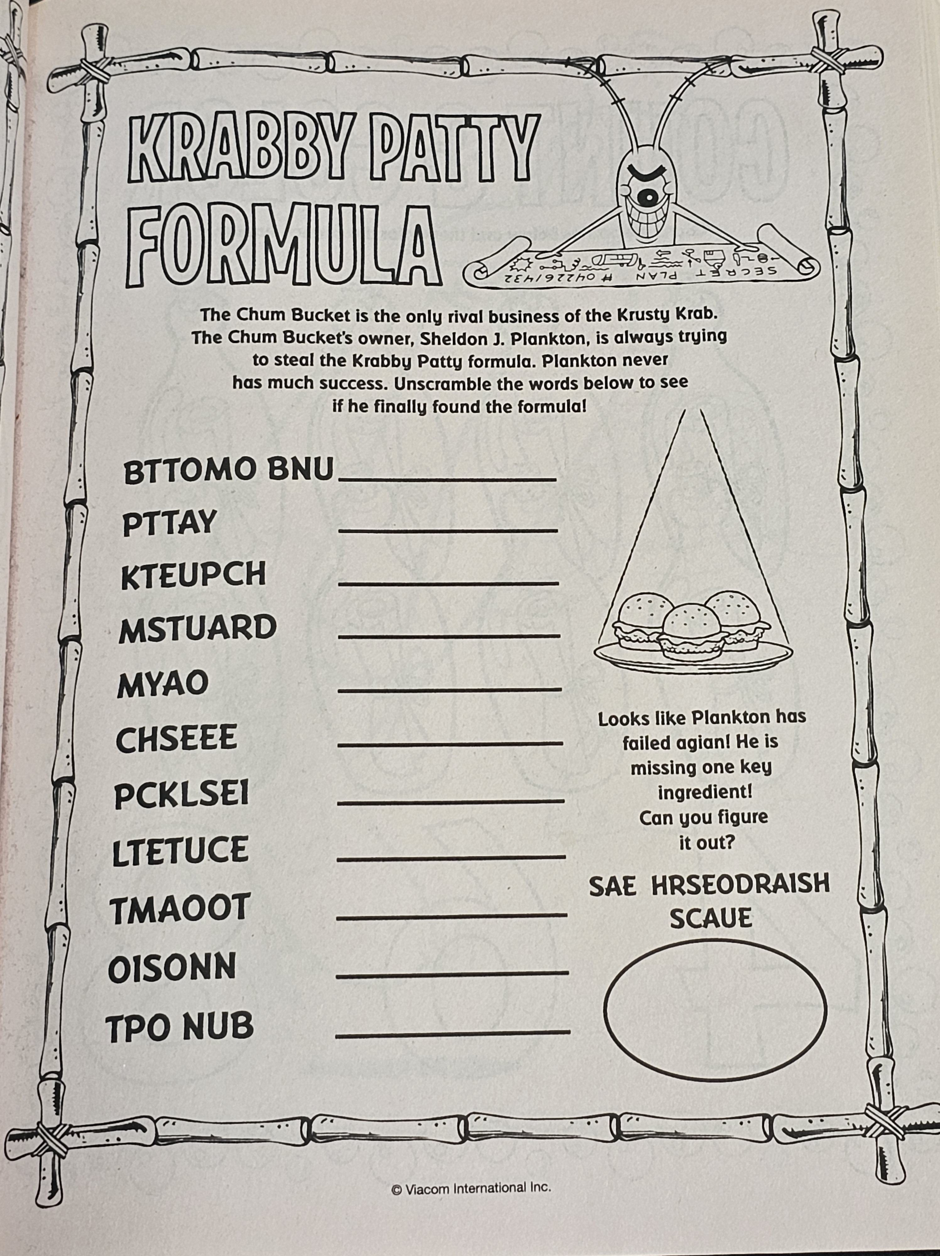 The Krabby Patty secret formula is where the ingredients are listed. According to SpongeBob in "Pickles" the correct order of ingredients on a Krabby Patty is "bun (bottom bun), patty, lettuce, cheese, onion, tomato, ketchup, mustard, pickles, bun (top bun)", from bottom to top, though other orders have been depicted throughout the series as well.