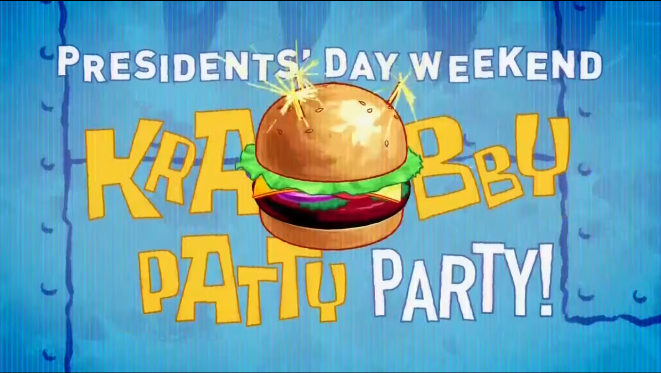 The Krabby Patty Party was an event featuring Krabby Patty-themed episodes, plus "never-before-seen" shorts based on the episode "Goodbye, Krabby Patty?" It aired on Nickelodeon during Presidents' Day weekend in February 2017.