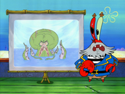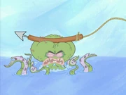 It is only seen on a projection screen, when Mr. Krabs shows his grandfather that there was a sea monster. He tries to throw a harpoon at it, but SpongeBob ends up catching it, and it unknowingly lands on the sea monster's head, knocking him underwater.