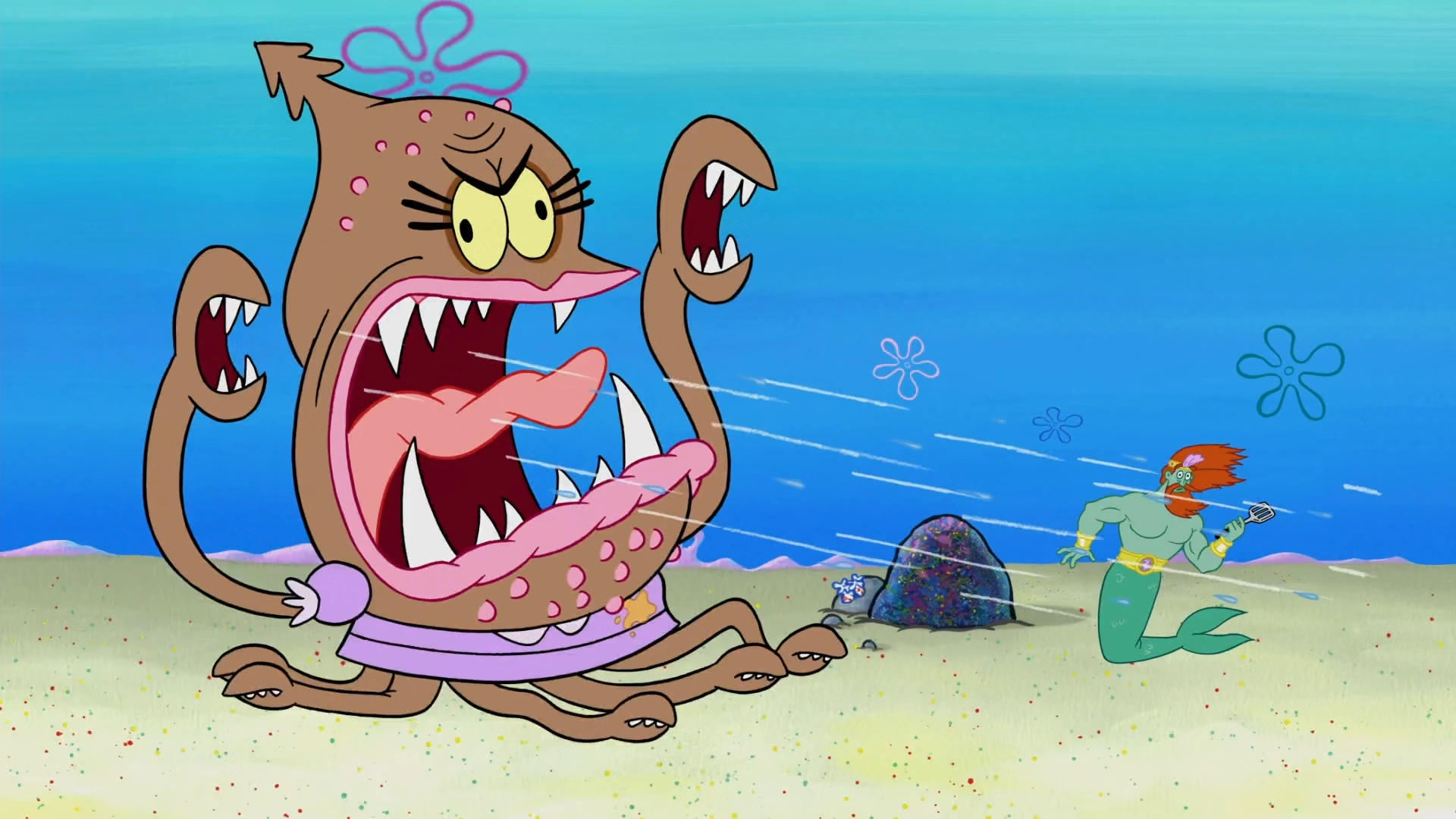 She appears again with her son at the end of the episode, where they are seen by Neptune and SpongeBob, who are on top of a monstrous Krabby Patty, and SpongeBob and Neptune chase her and her son.