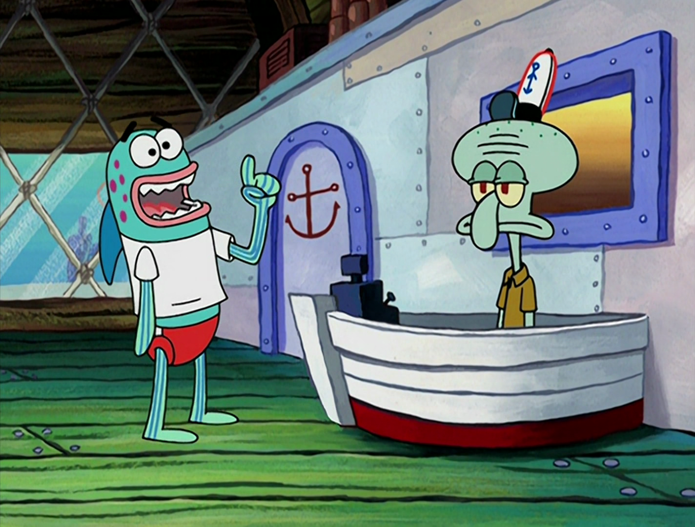- After the narrator refers to Squidward as the not so good employee, he is able to hear him and looks slightly offended.