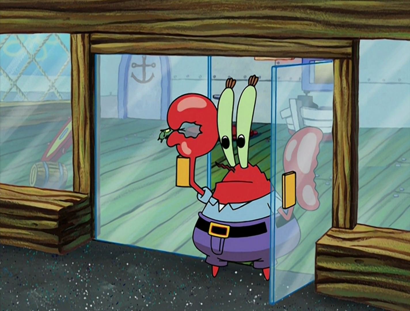- In the first exterior shot of the Krusty Krab, there appears to be two enter signs.