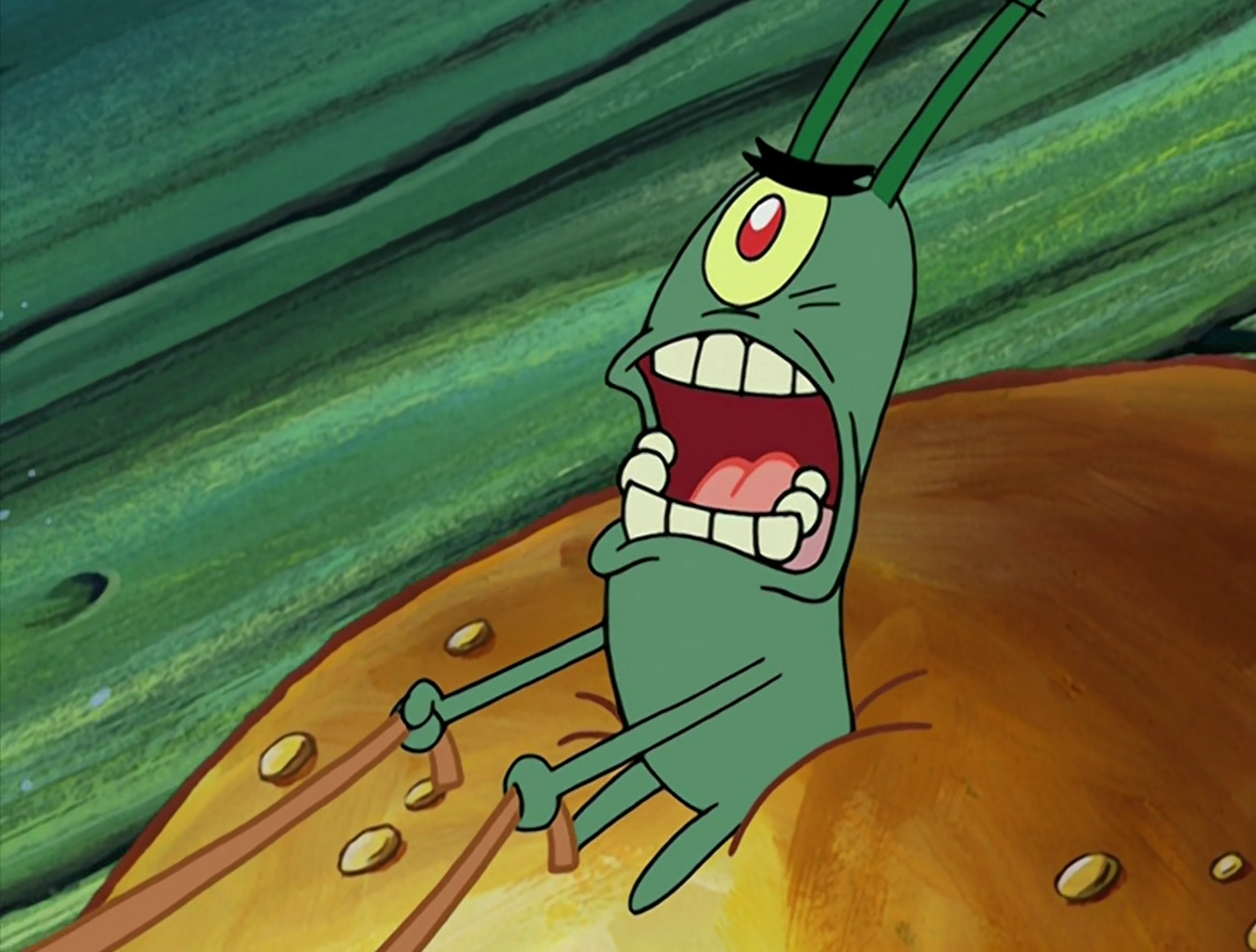 - In this episode, Plankton's eyelid is dark green, but in other episodes from the first three seasons, it is the same color as his deep-green body.