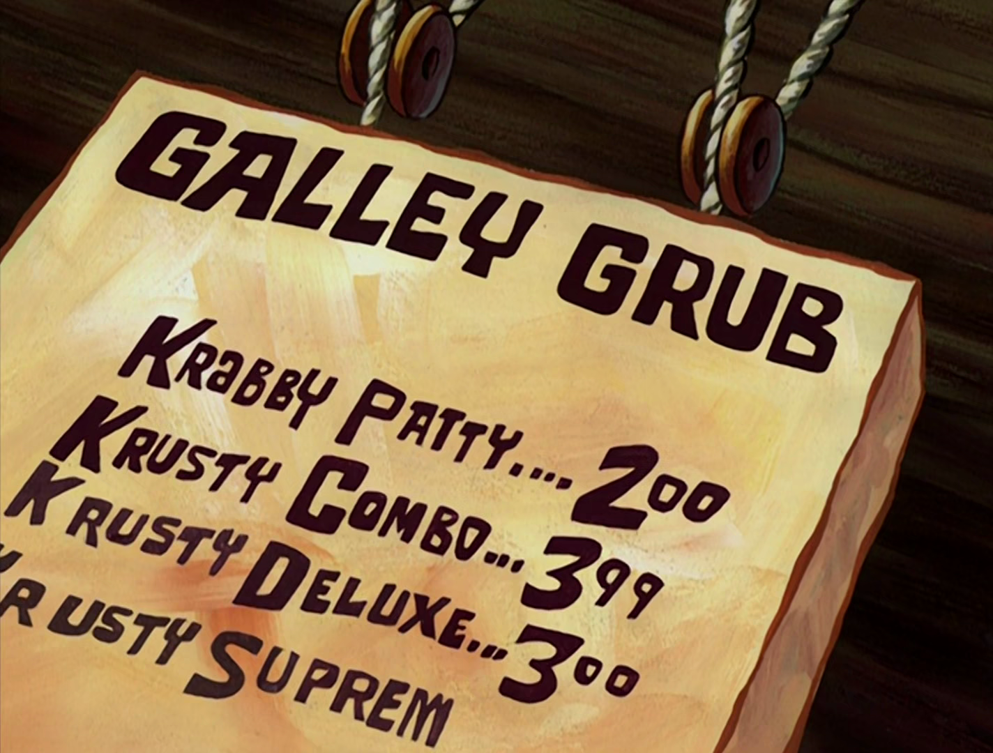 - In the very beginning, on the Galley Grub, "Krusty Supreme" is misspelled as "Krusty Suprem." There is no price for the "Krusty Supreme" and the text is distorted.