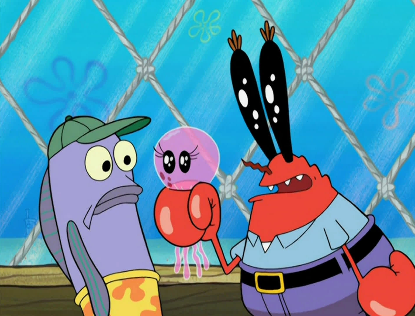 After Squidward yells out that he gave the ick to everyone in the Krusty Krab, Wobbles and Billy angrily rise up from their table together to confront him.
