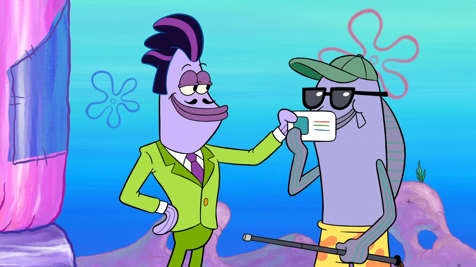 Two different colored newsies each give Sir Urchin and Snail Fail a newspaper announcing the Bikini Bottom talent show.