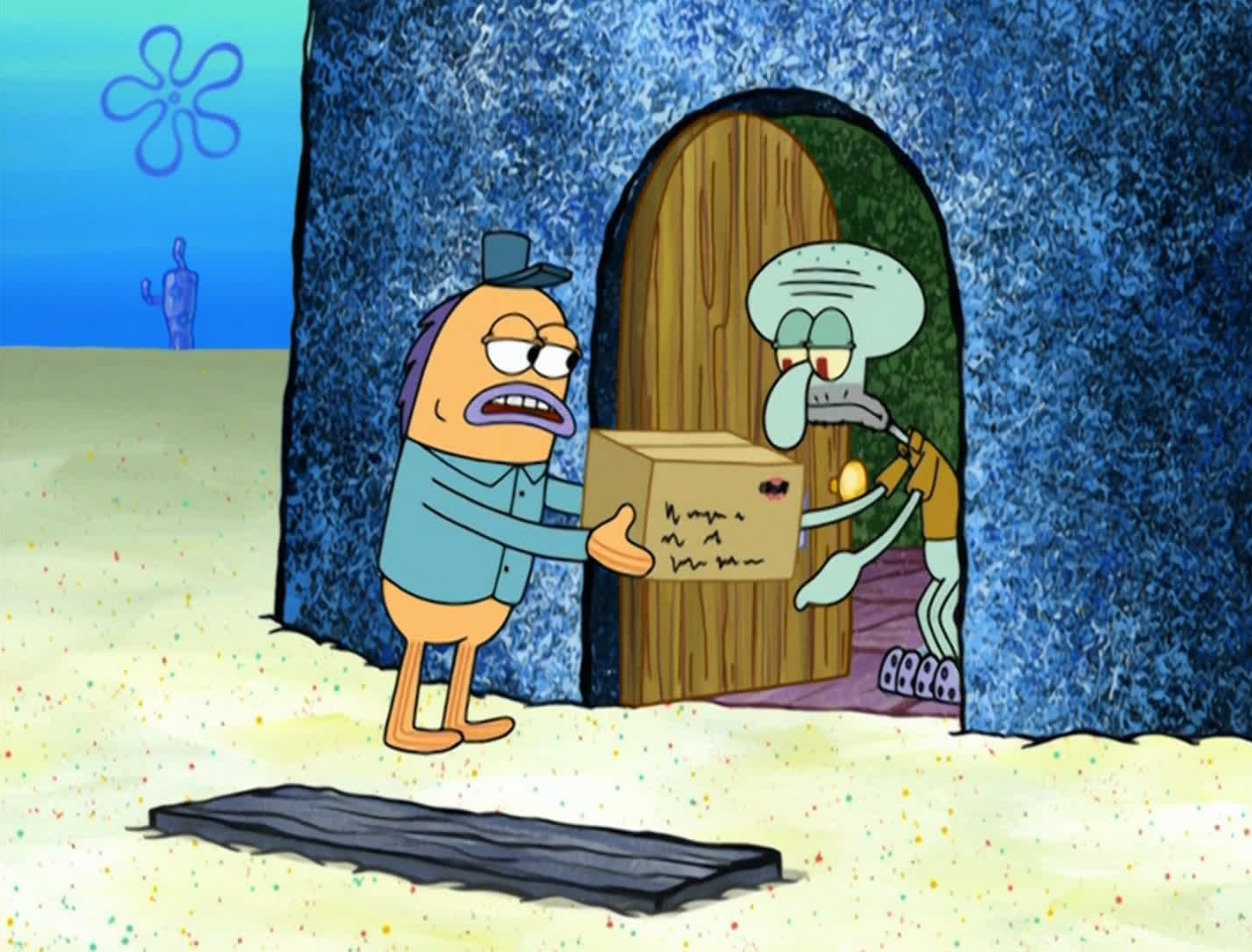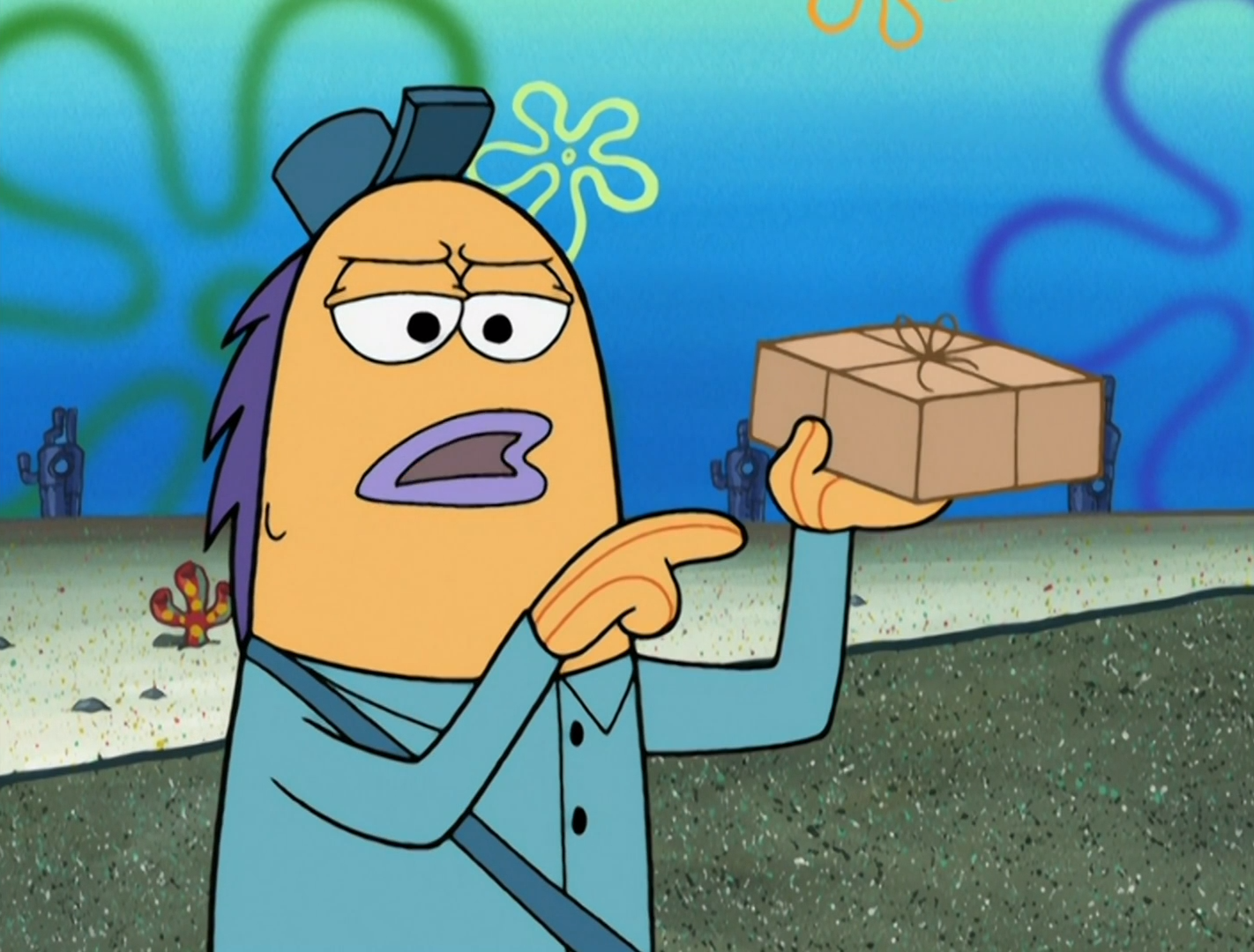 He delivers Squidward's package from SpongeBob and mistakenly calls him Squidward "Tentaclees."