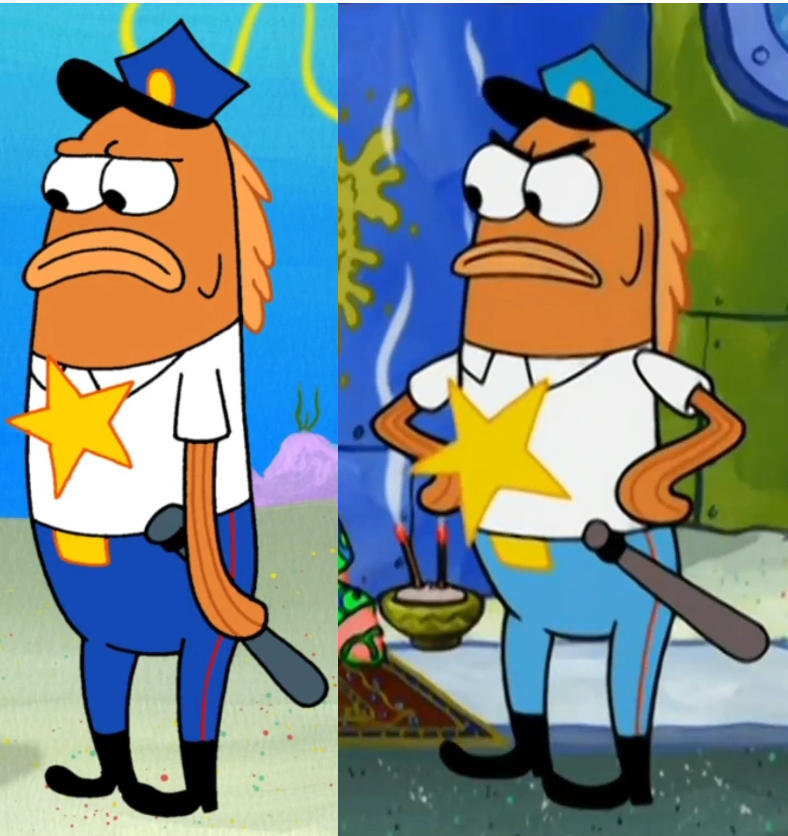 Policeman 2 and a purple Incidental 118 appear as two sanitation police officers that were called by Squidward to condemn SpongeBob's house for being too filthy. He tells SpongeBob his house will remain condemned until he throws away all of his garbage. Here he is colored slightly lighter orange, his lips are slightly darker orange and his dorsal fin is slightly dark red.