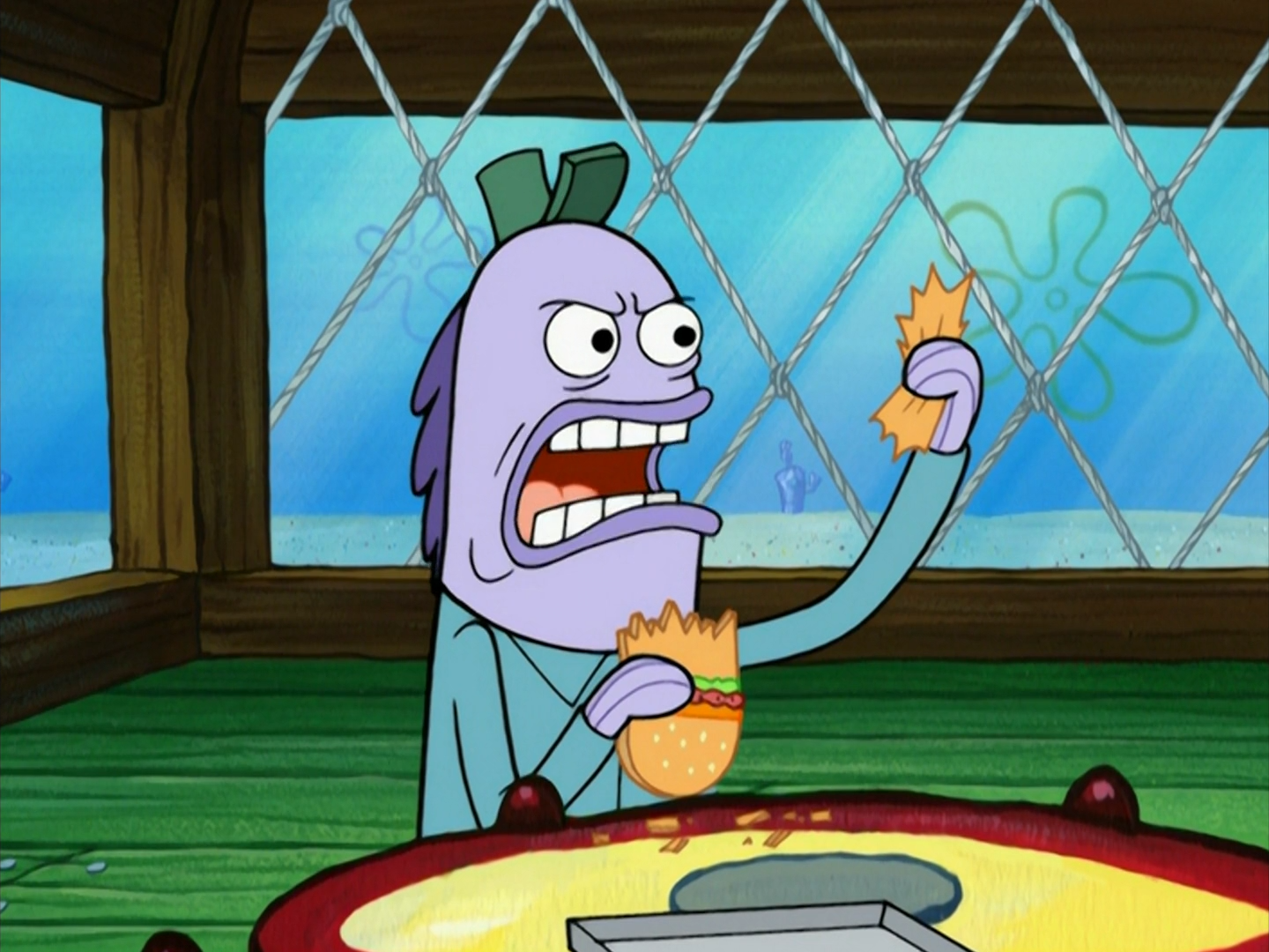 Mr. Mailman appears at the Krusty Krab, where he becomes unsatisfied with the paper patties created by SpongeBob's computer.