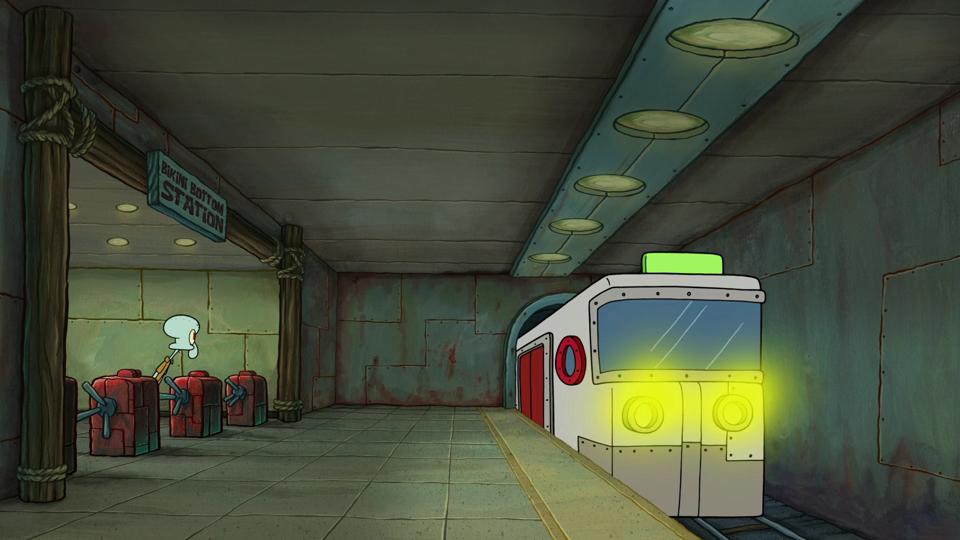 Squidward waiting for a train.