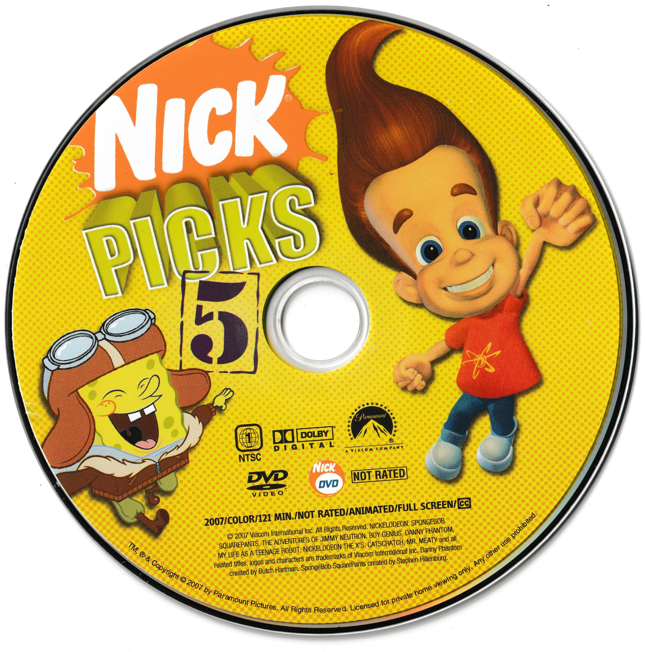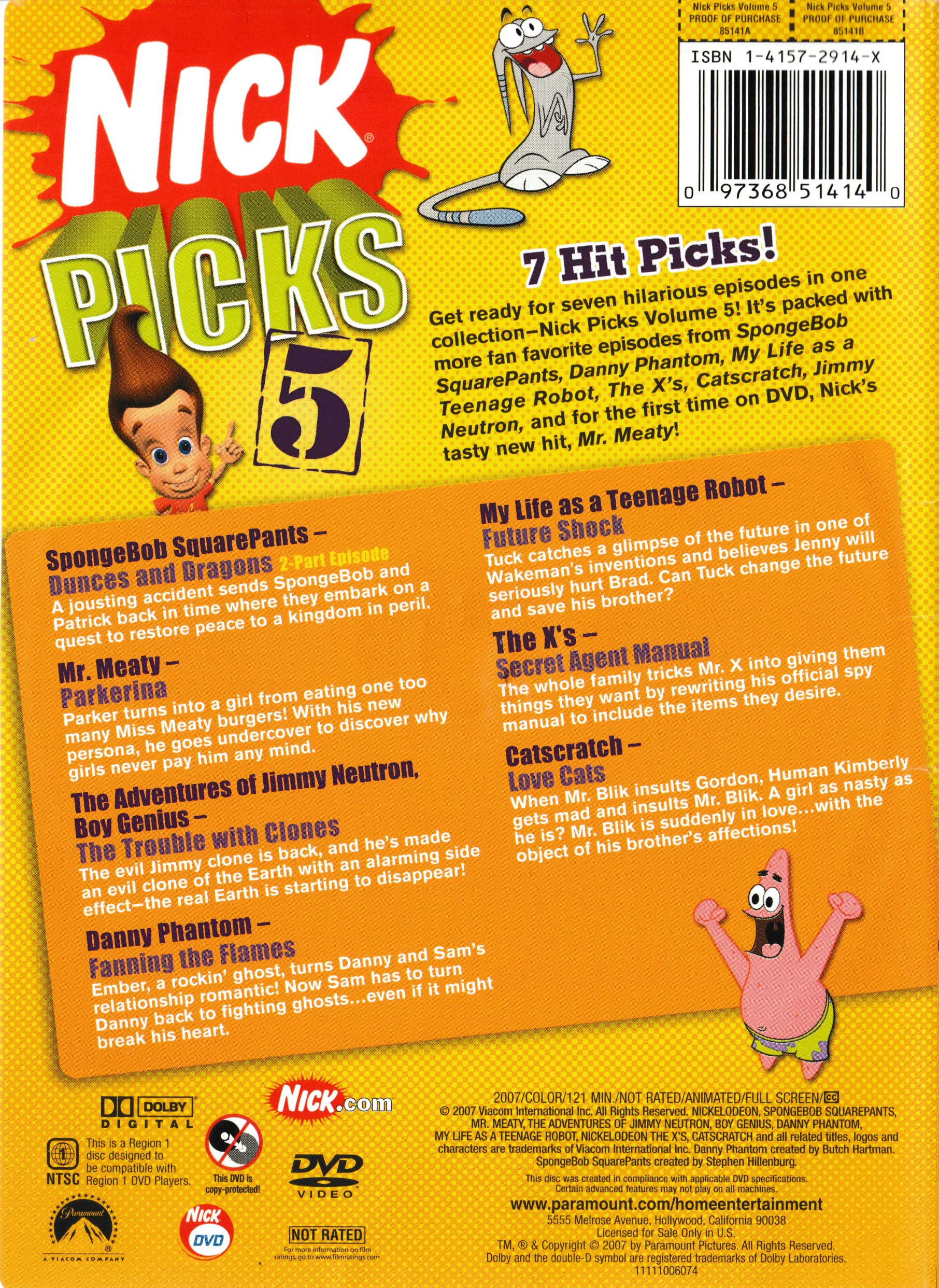 Nick Picks Volume 5 is a Nicktoon compilation DVD release that was released on March 13 , 2007 and contains one episode from season 4 of SpongeBob SquarePants , along with select episodes of Mr. Meaty , The Adventures of Jimmy Neutron, Boy Genius , Danny Phantom , My Life as a Teenage Robot , The X's , and Catscratch .