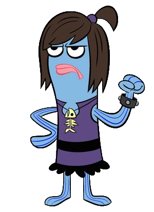 She is a light blue goth fish who wears a purple and black dress, a black studded leather bracelet, and a fish bone necklace. She has light pink lipstick and medium length black hair with bangs. Her hair is tied up in a ponytail in the back with a purple hair tie and she appears to be wearing eyeliner.
