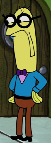 He is a skinny yellow anchovy who wears a light blue sweater with brown pants and large round black glasses. He has a large visible bald spot on his head. He was originally maple brown in his debut.