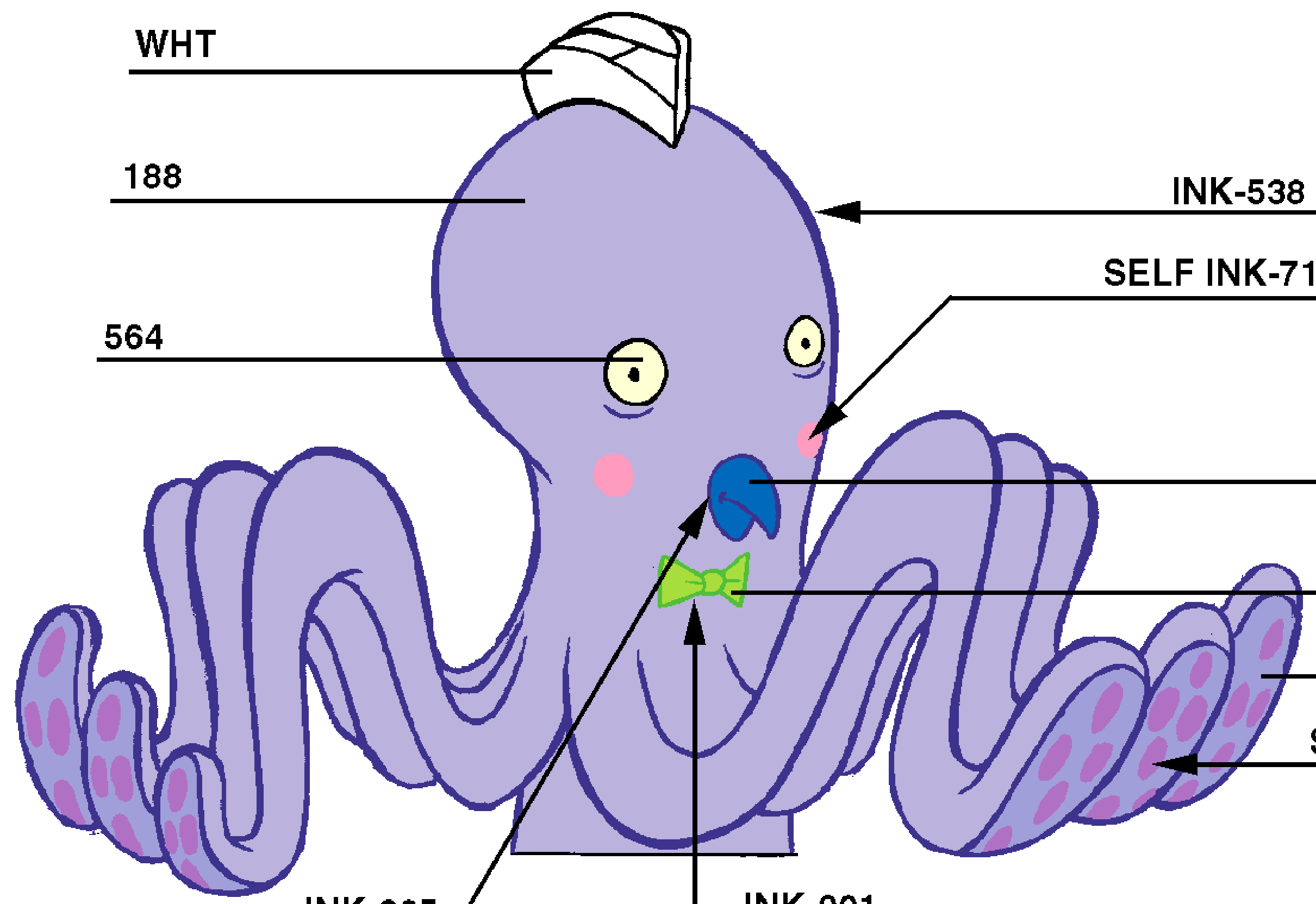 He is a light purple octopus with dark purple lips and pink cheeks. He wears a white chef's hat and a light green bow tie.