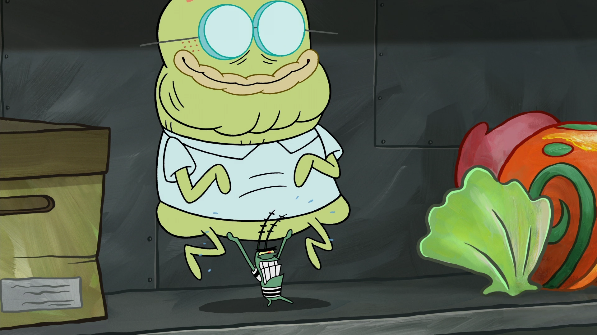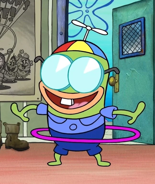 He is shown randomly moving on the screen during the montage of the Krusty Krab's 24-hour business shown on the Bikini Atoll screen.