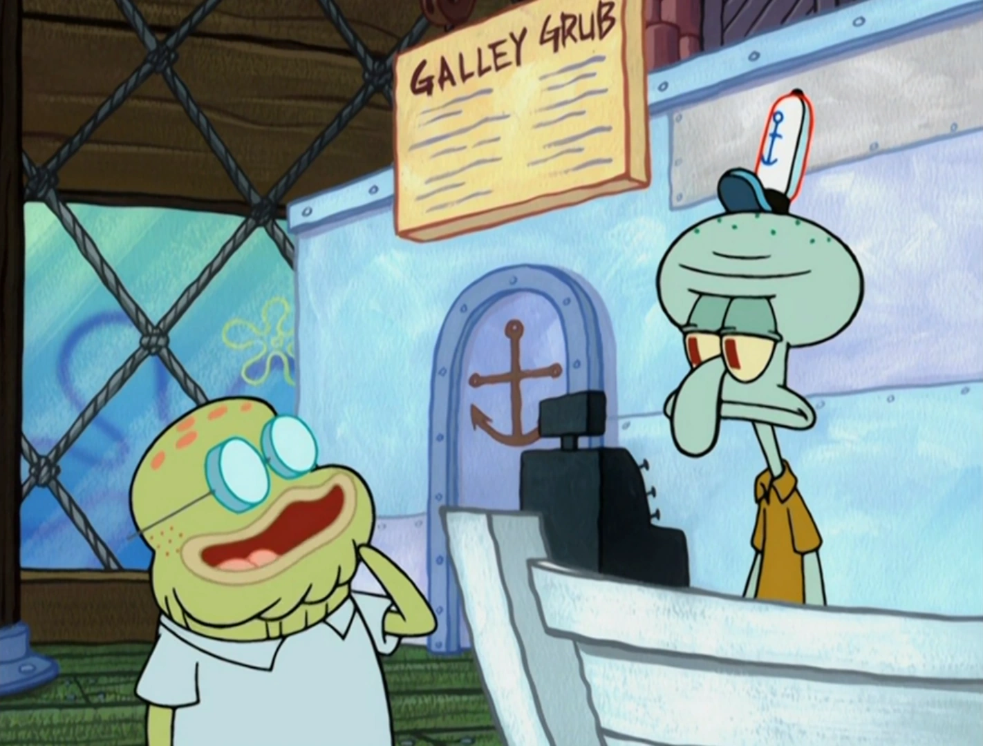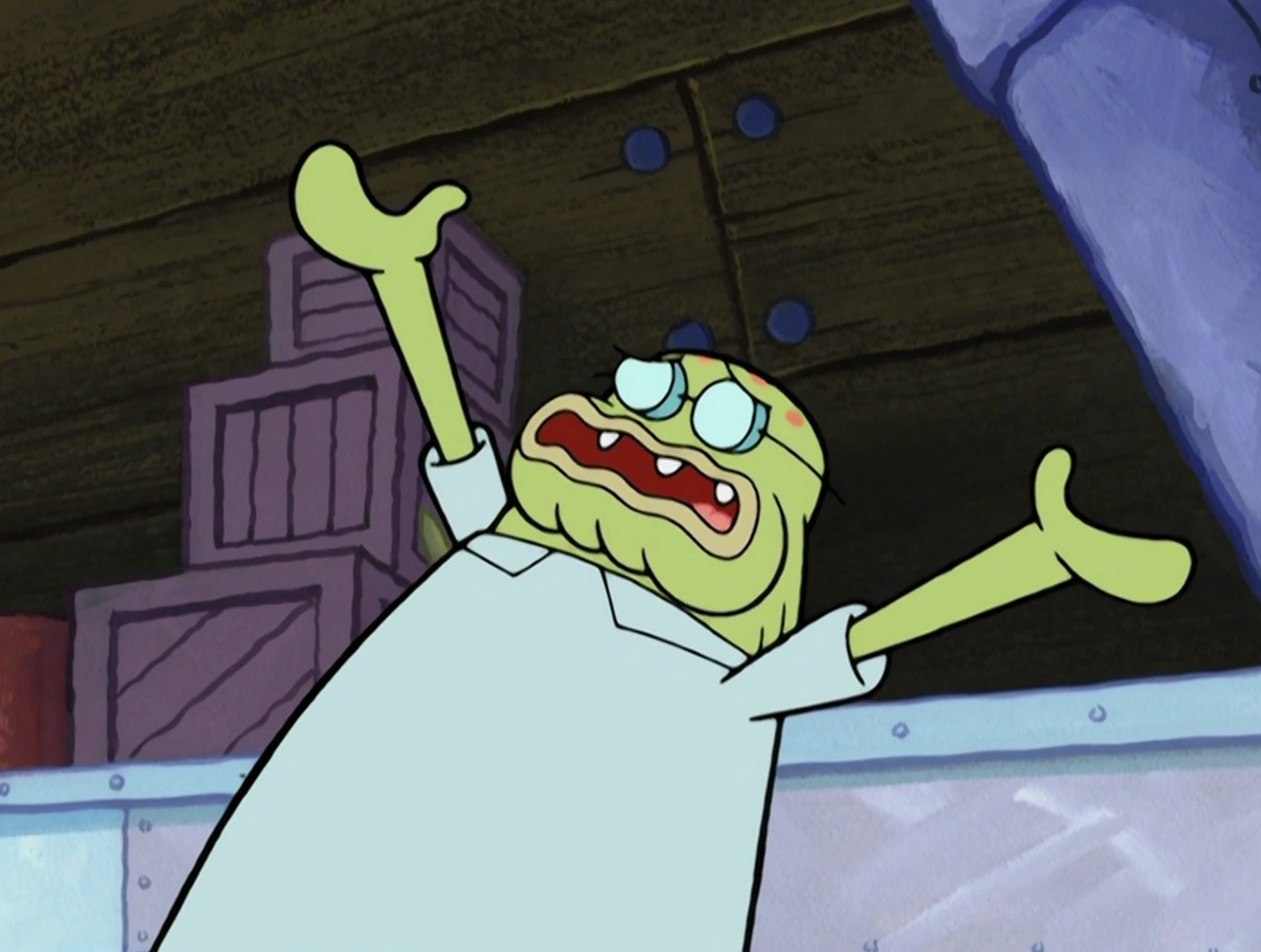 He is part of the riot against Squidward where he asks him what the hold up is and is then seen leaving the Krusty Krab.