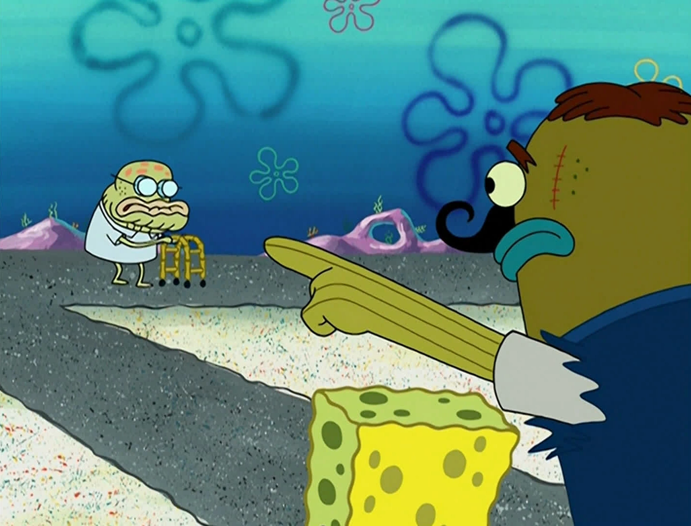 SpongeBob confiscates his walker to give to King Patrick, which causes Old Man Walker to fall face down.