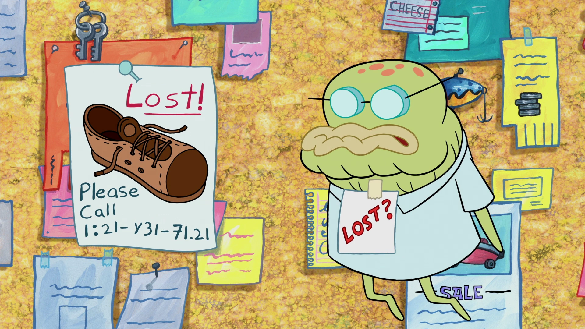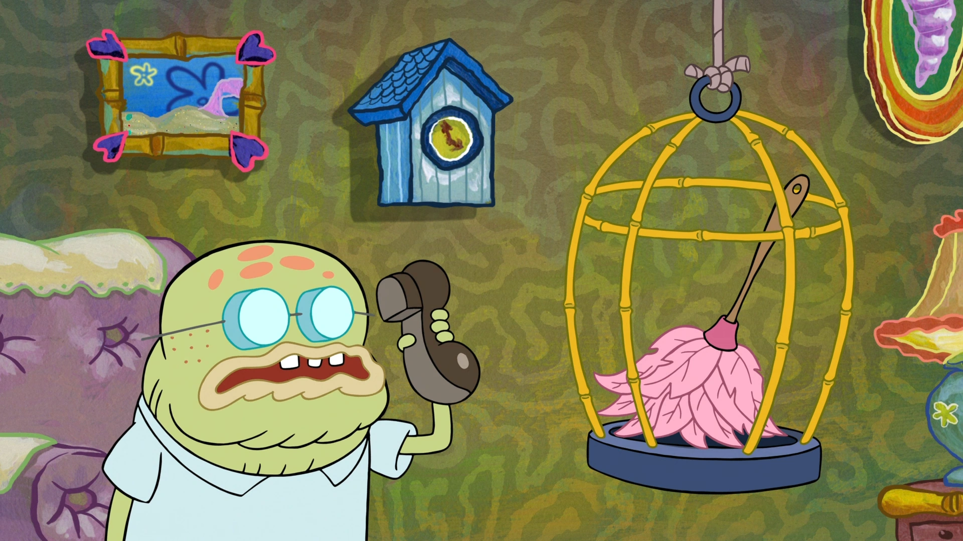SpongeBob calls him for help, but Old Man Walker answers his shoe instead of the phone.