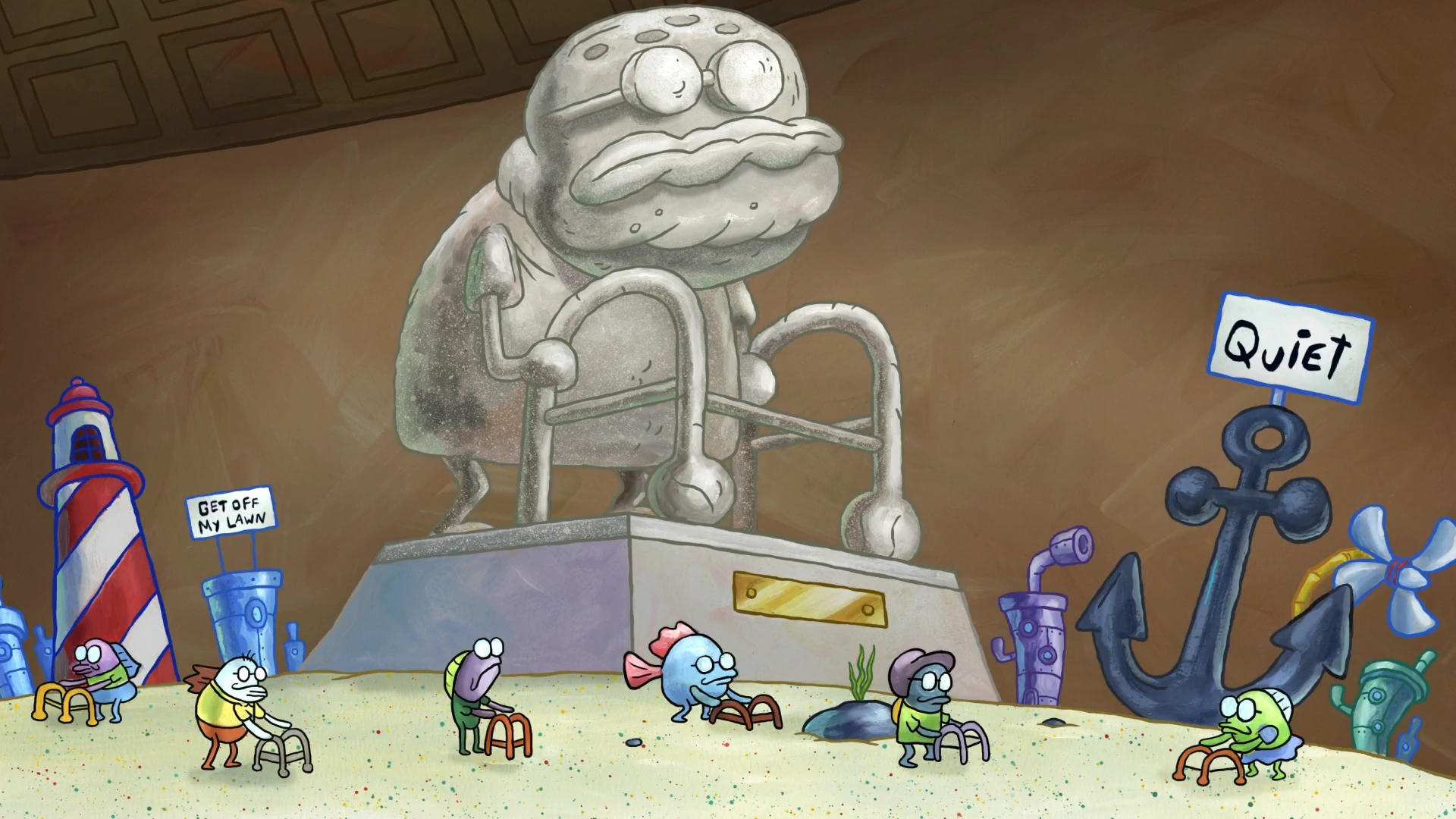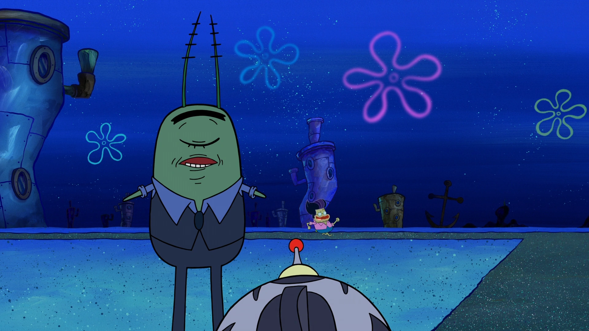 He appears as the security guard for the Museum of Bikini Bottom History where he constantly tells SpongeBob, Patrick, and Sandy not to fool around in the museum. The three of them eventually go to his secret floor of the museum and learn he is planning to be the ruler of the future. He tries to stop the three after they find out but ends up going up with the museum.