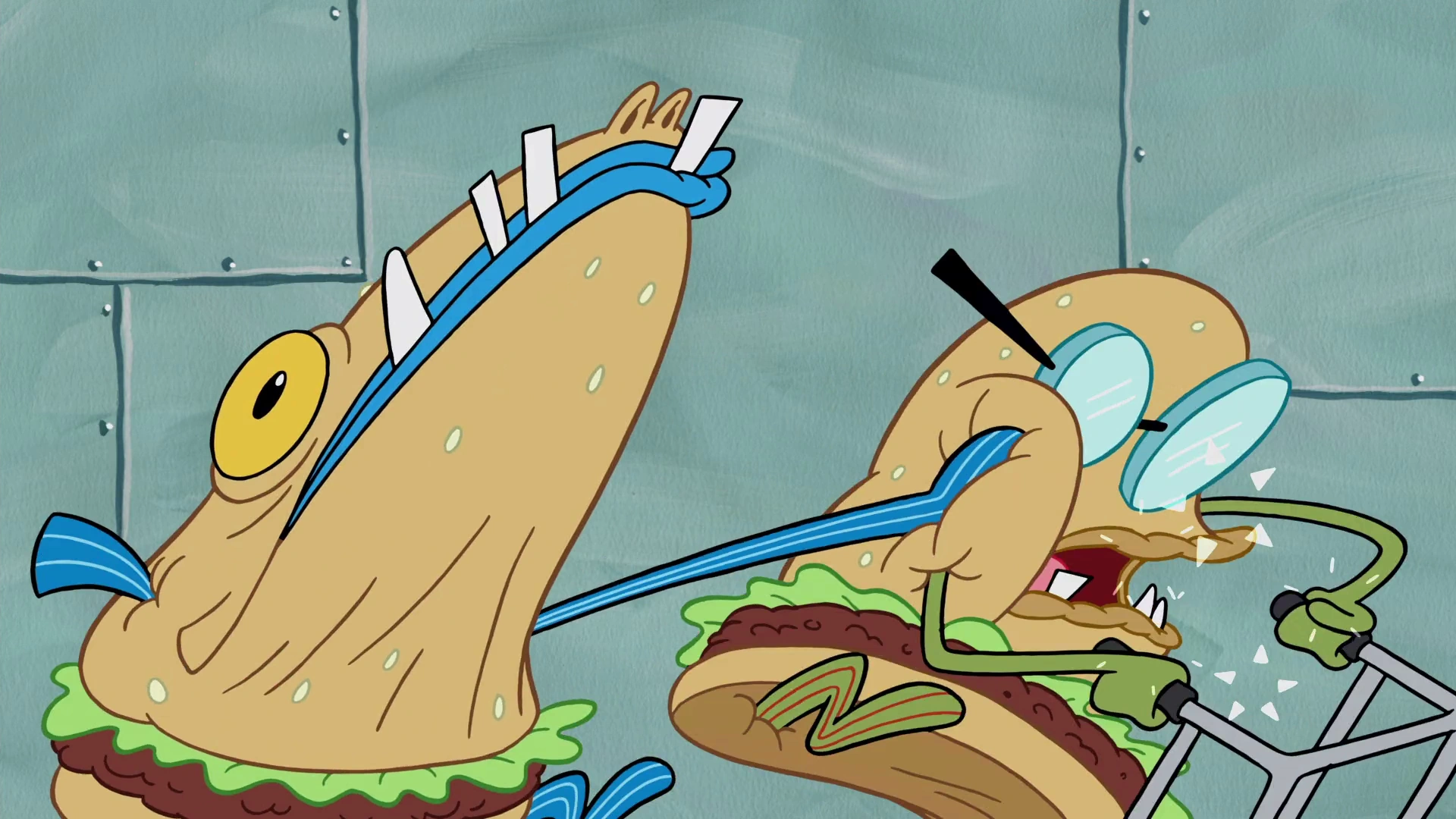 When Tom (Inc 6) protests his Krabby Patty not being made with love, he stands up and throws it on Old Man Walker.