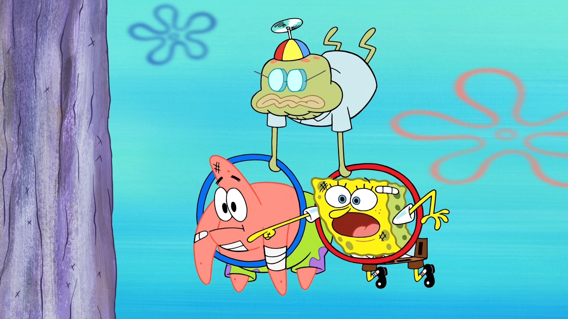 Old Man Walker flying while carrying SpongeBob and Patrick with his hoops.