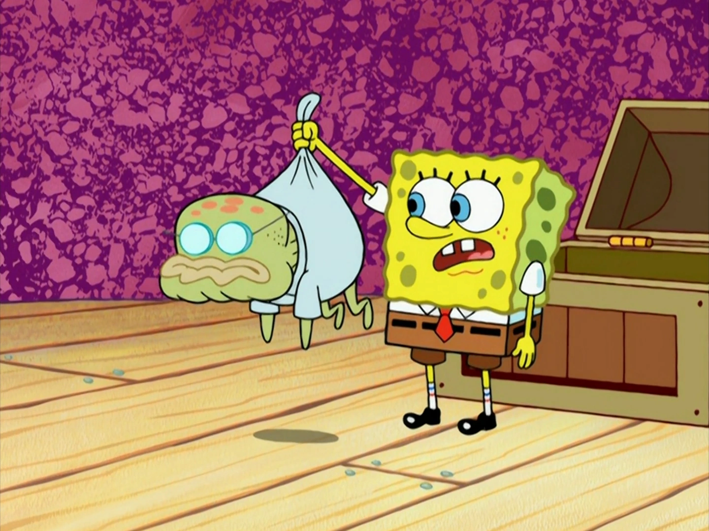 He was found in SpongeBob and Patrick's toy chest.