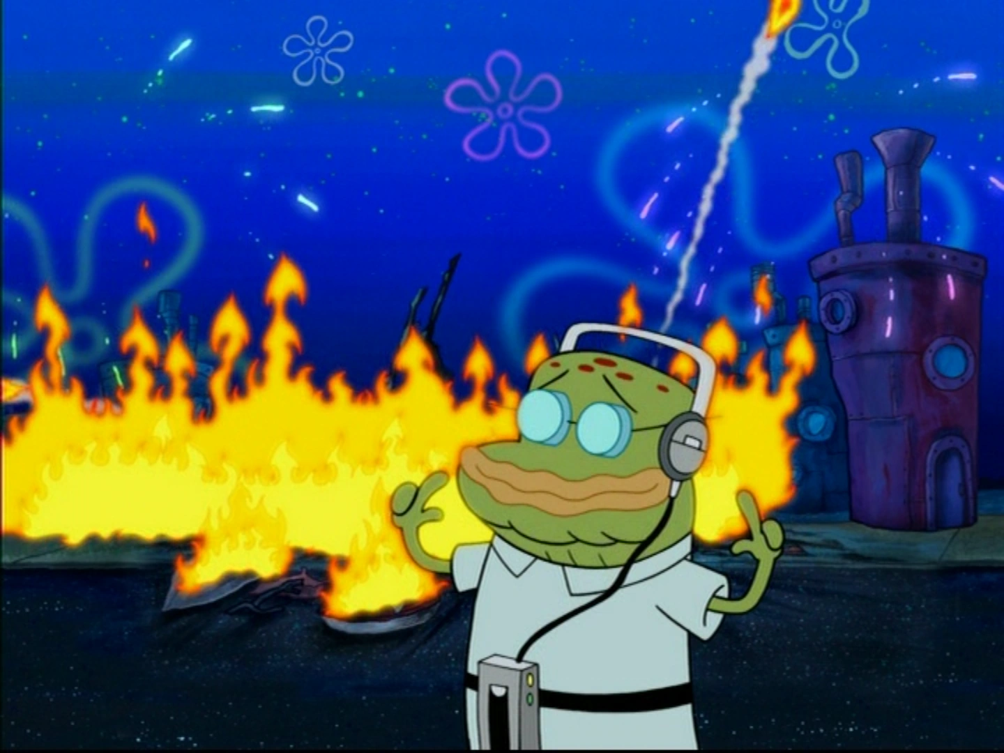 He is part of of the fire department and breaks his skeleton after falling from a tree. Later in the episode, when the fire department is on fire, he rescues SpongeBob, Patrick, Squidward, and Larry from the building and easily extinguishes the fire.