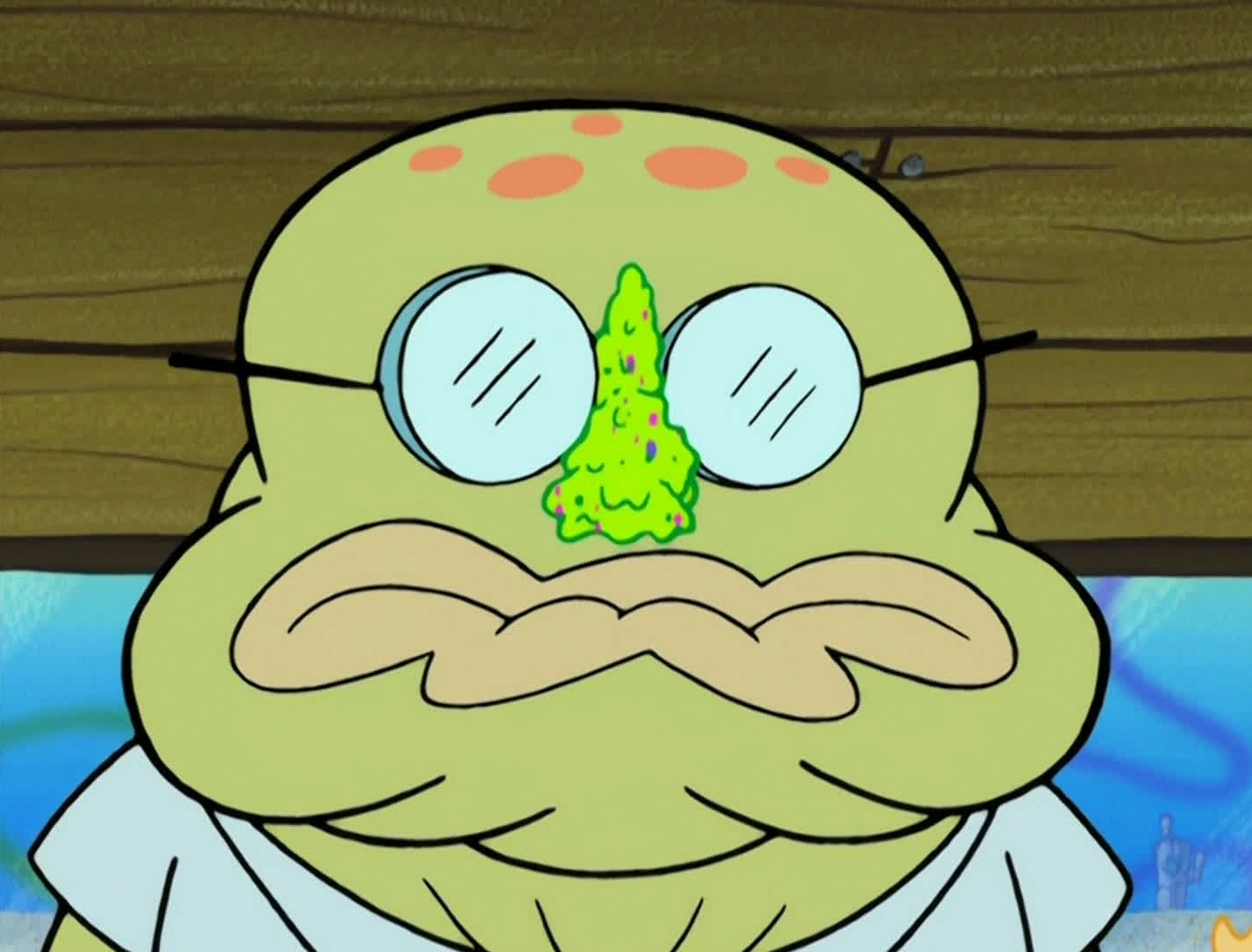 He makes multiple cameos throughout the episode, being one of the Krusty Krab customers who is allergic to Squidward's cologne.