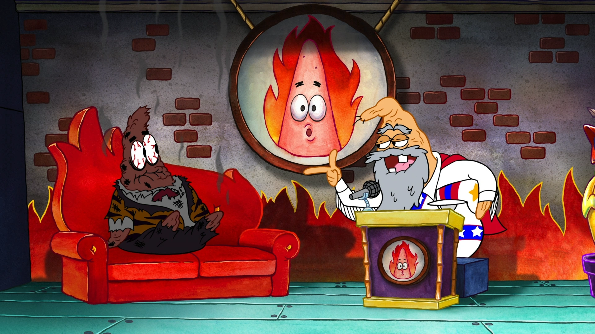 GrandPat arrives onto the show next, but ends up swearing in front of the audience. Squidina takes him away as SpongeBob is brought on stage. SpongeBob makes a few jokes about Patrick, but his gentle humor does not enlighten the audience. SpongeBob rips his pants off in frustration, which makes the audience laugh. Squidina is about to close the show, but Patrick says that he should roast himself. He starts making fun jokes about himself, but soon starts actually fighting himself, which enthuses the audience.