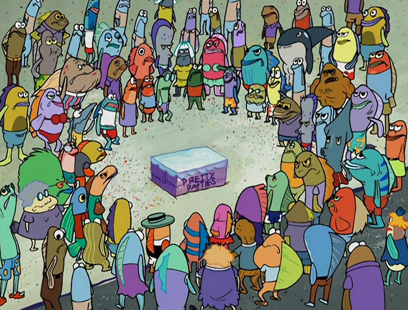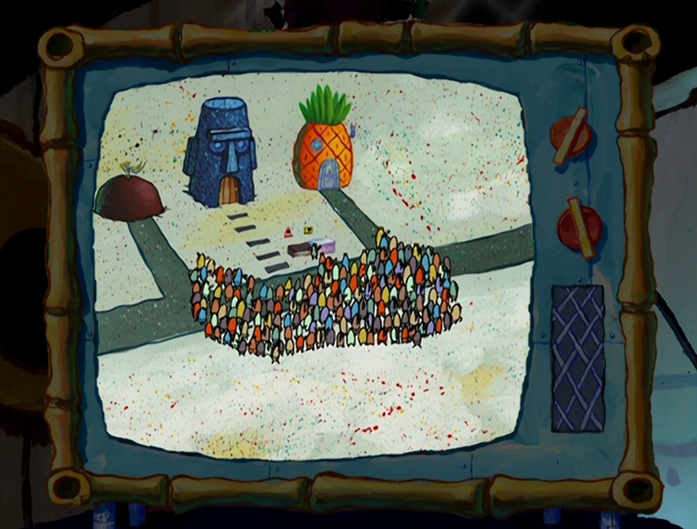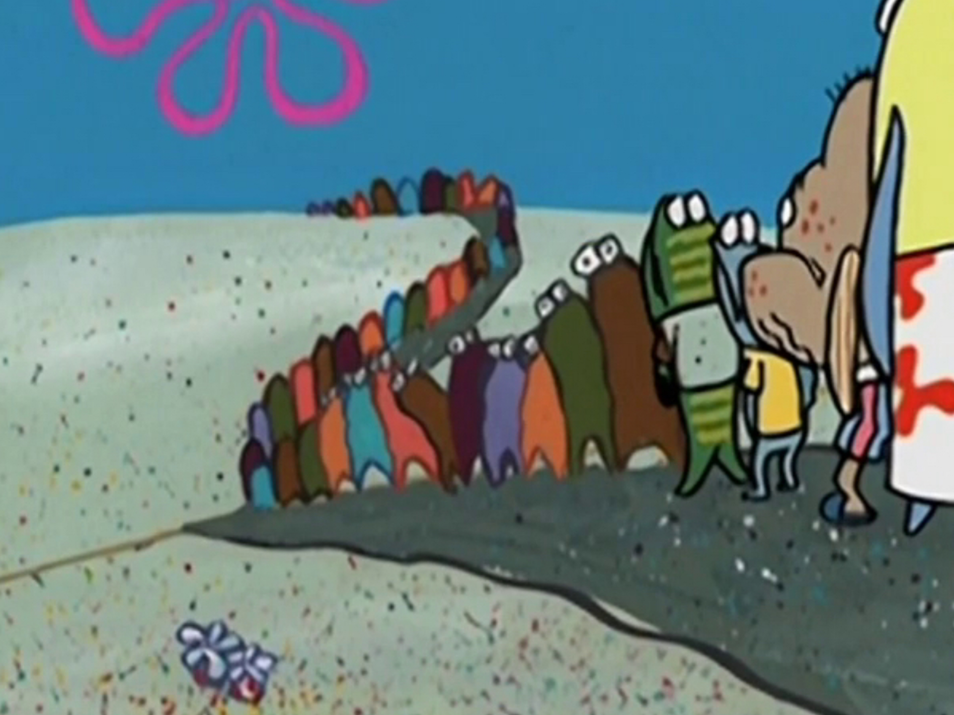 - When Mr. Krabs is being chased by everyone while SpongeBob is squeaking pickle slices, the Chum Bucket and the road are nowhere to be seen.