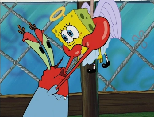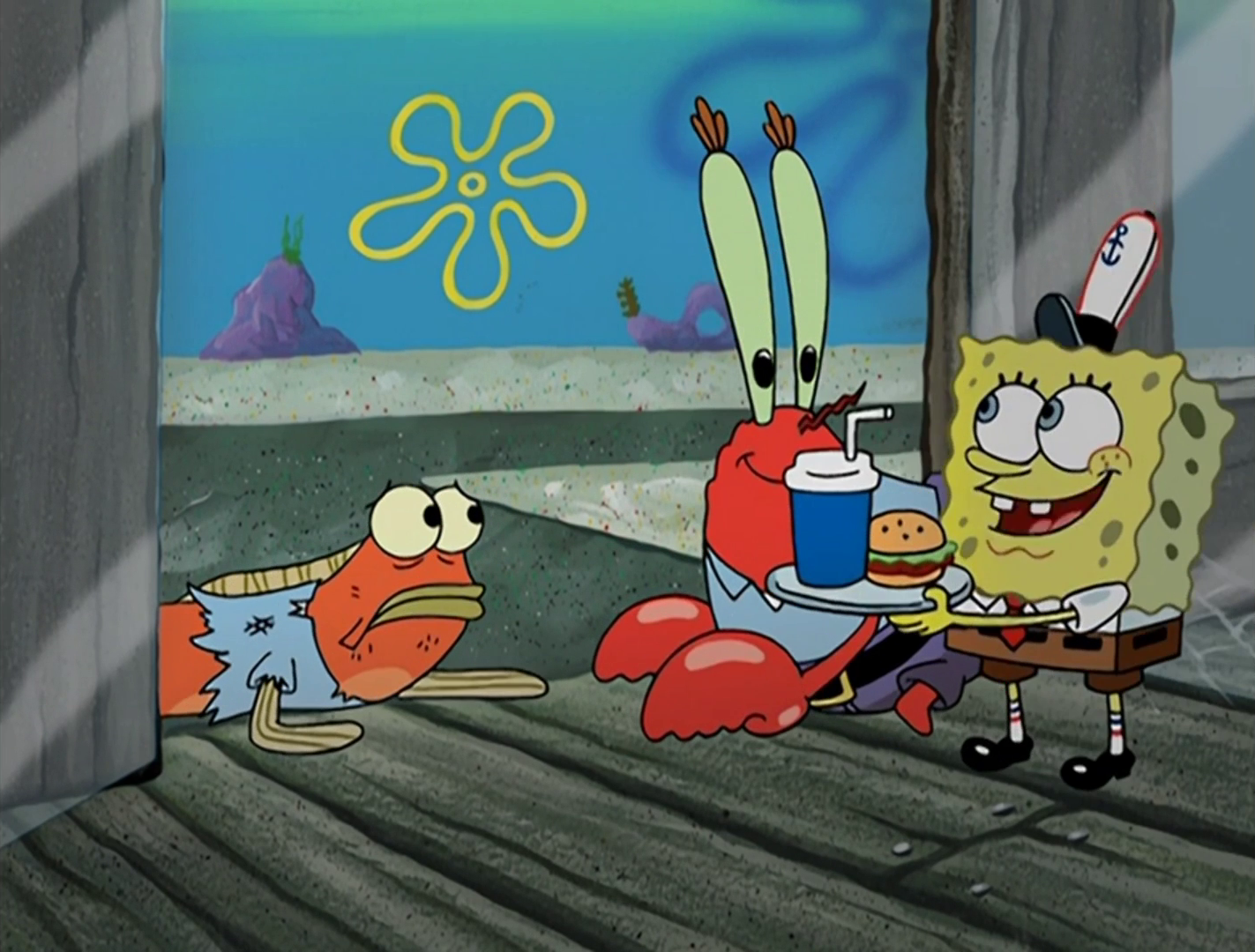 - The same error is present in the opening scene, when the thirsty customer crawls into the Krusty Krab, and when SpongeBob vows to start his own stand when Mr. Krabs and Squidward make fun of the Pretty Patties.