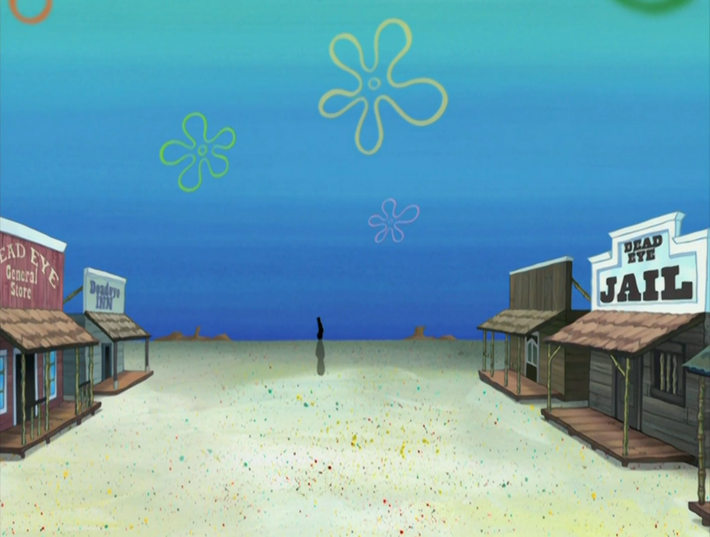 Mr. Krabs tells the two of his great-great-grandpappy Krabs, who invented a painful security invention that hurts the fingers of anyone who touches the booby-trapped dollar bill. While walking, SpongeBob runs into Sandy, who reveals that she has a relative named Rosie Cheeks, who was the first squirrel to discover oil in Texas. Feeling sorry for SpongeBob, Sandy takes him to the library to "dig around his family tree." SpongeBob learns that he is the great-great-great-great-great-great-great grandson of a Western hero, Sheriff SpongeBuck SquarePants. Sandy begins to tell SpongeBob the story of SpongeBuck SquarePants. In flashback, SpongeBuck arrived at a town named Dead Eye Gulch, which was formally named Bikini Gulch until it got taken over by a dangerous outlaw named "Dead Eye," and goes to a theater/saloon named Krusty Kantina.