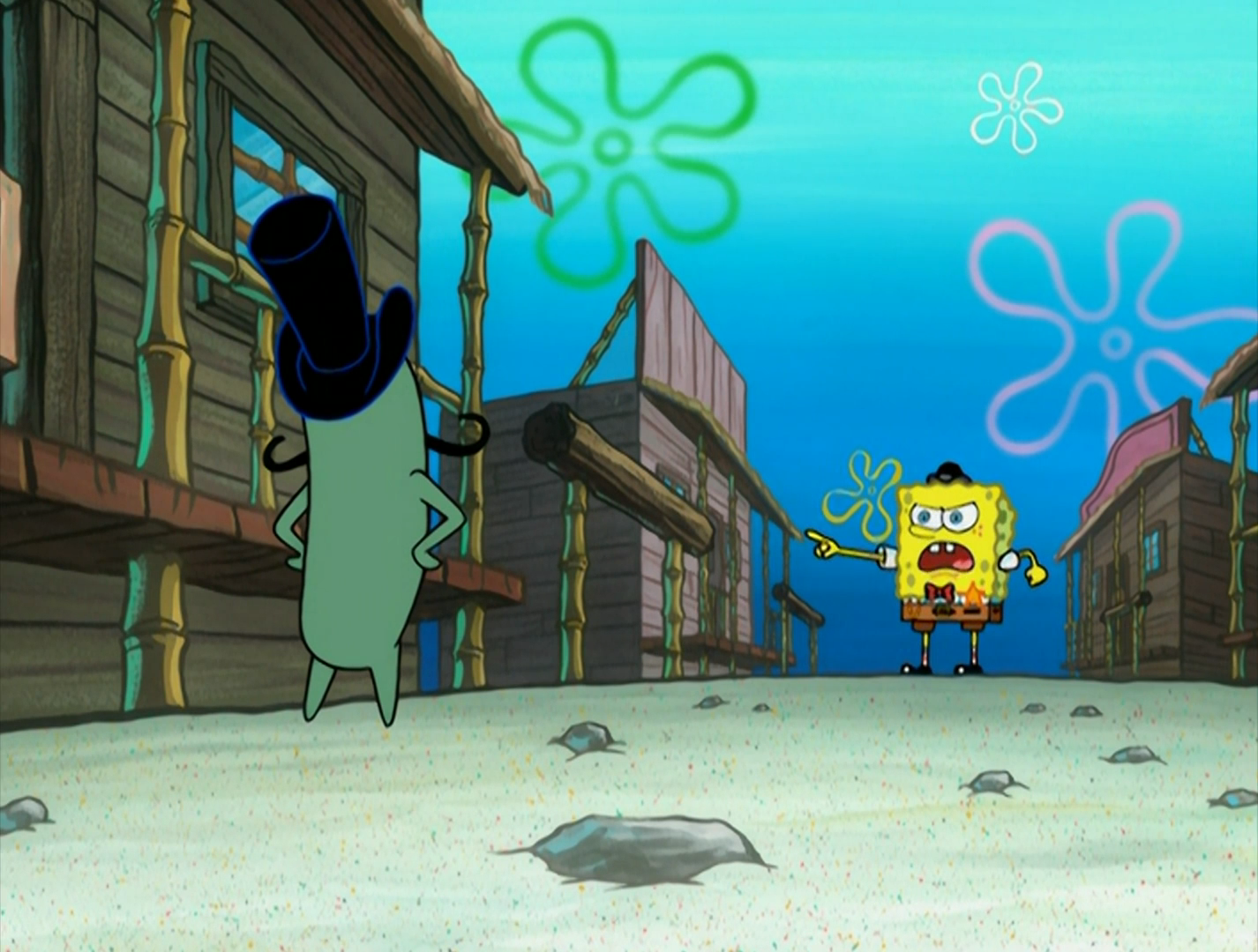 SpongeBuck got kicked away into a desert while talking to longhorn skulls of his imagination, and Pecos Patrick Star (Patrick's ancestor) met him. SpongeBuck got a nickname for him, and it was Idiot Friend. Pecos Patrick told him to defeat Dead Eye Plankton by smacking him several times. When they get back to town (via a giant cactus that made SpongeBuck and Pecos Patrick jump so high that they landed in Dead Eye Gulch), SpongeBuck met Dead Eye Plankton, and the two walked towards each other as though it was a Western duel. However, the fight ended very quickly, as SpongeBuck stepped on Dead Eye Plankton. Something that has apparently never been done or thought of before in Dead Eye Gulch. Pappy Krabs also tried stomping on him, and he decided to set up a business where the townsfolk could squish Dead Eye. Polene Puff (Mrs. Puff's ancestor) was first in line to crush him. All the residents of Bikini Gulch give three yee-haws for SpongeBuck and built a golden statue of him in his honor (Squidward's ancestor liked his design better, which was him as a muscular man), and Pappy Krabs, Hopalong Squidward (Squidward's ancestor), Pecos Patrick, and Polene Puff holding SpongeBuck in a picture.