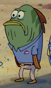 He is a dark green fish with three darker green back stripes on his back. He has olive green lips and reddish-brown fins. He wears a blue polo shirt with a pink shirt label and light tan pants with a brown belt with a golden buckle.