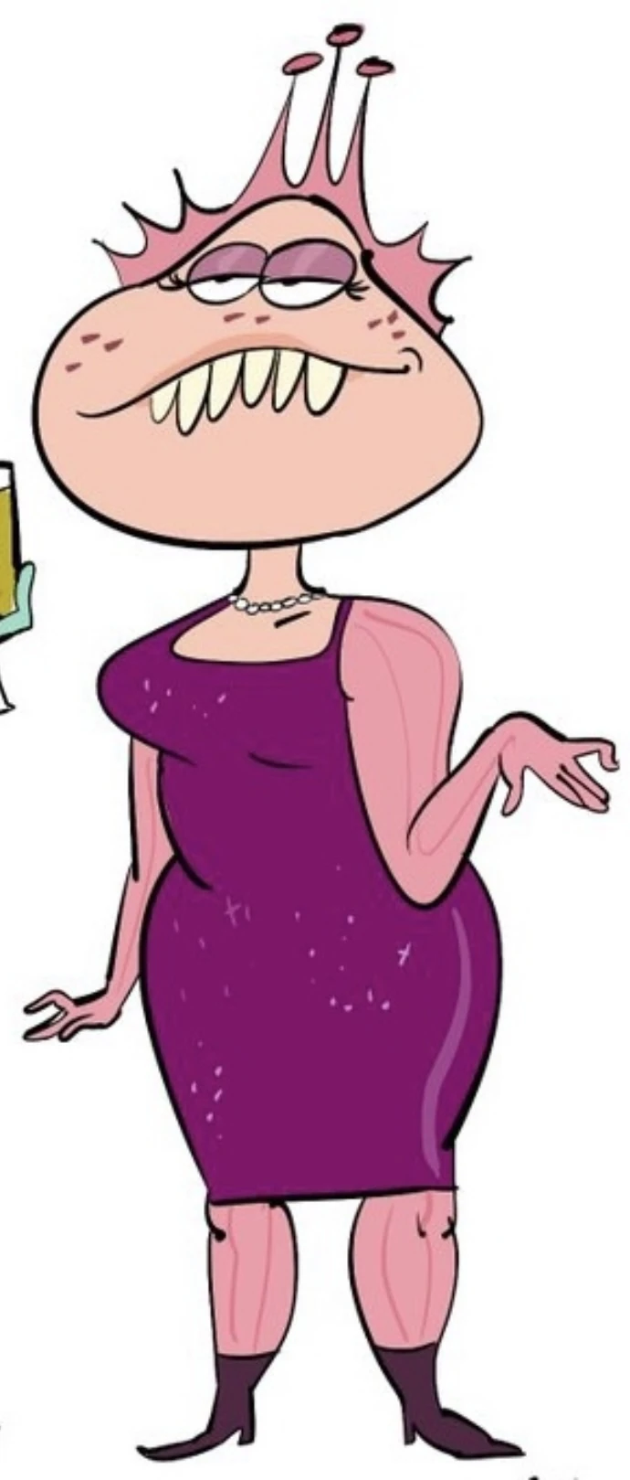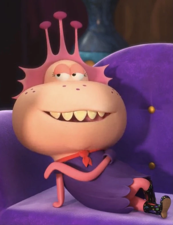 She is a short light pink fish with pink freckles, five large teeth, and dark pink fins on her head that resemble a crown. She wears a purple sleeved dress, a red kerchief, and black boots covered with pictures of gems.