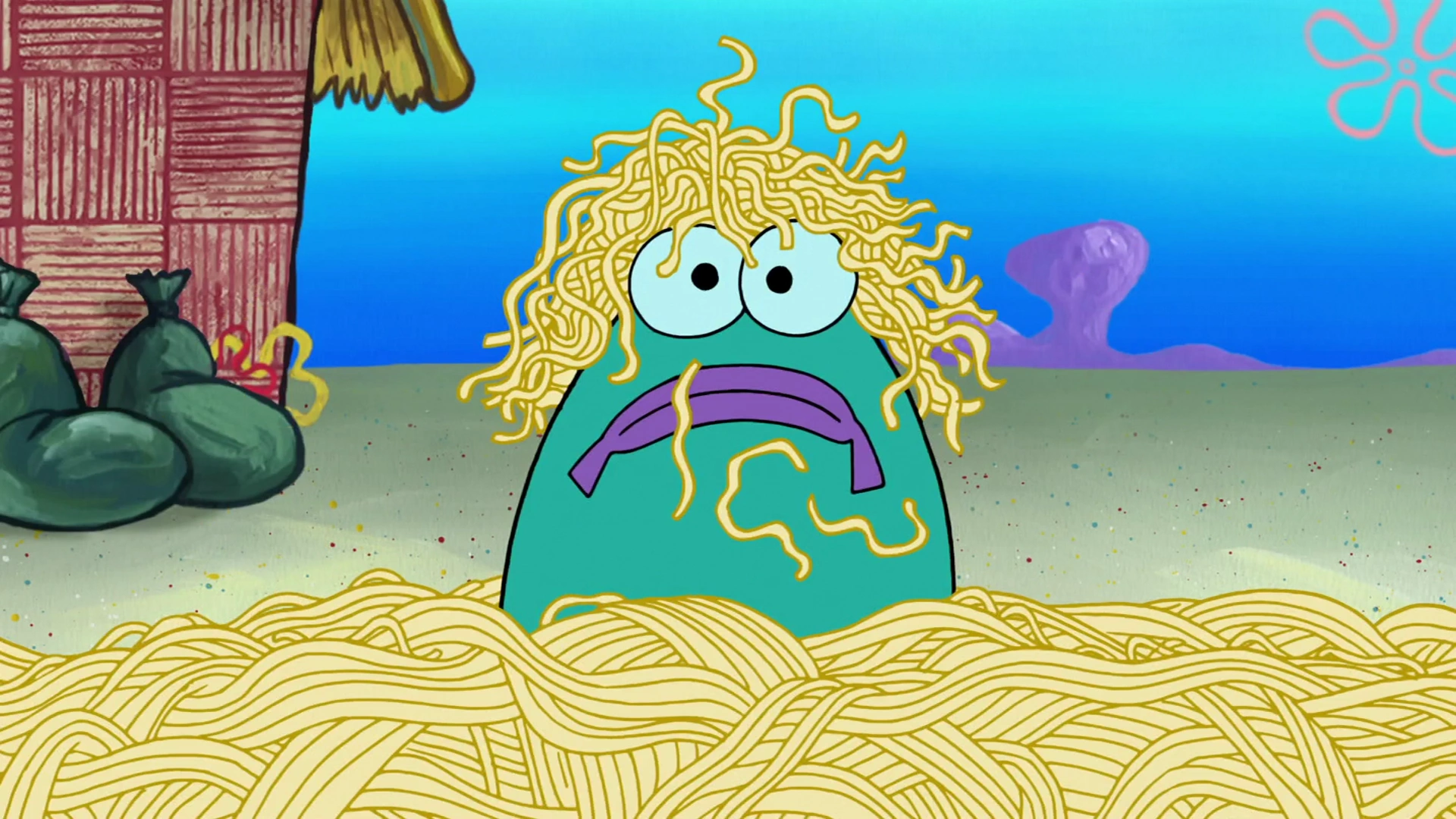 - Noodleman's head was seen without the costume, but the rest of his body was fully covered by his costume's noodles.